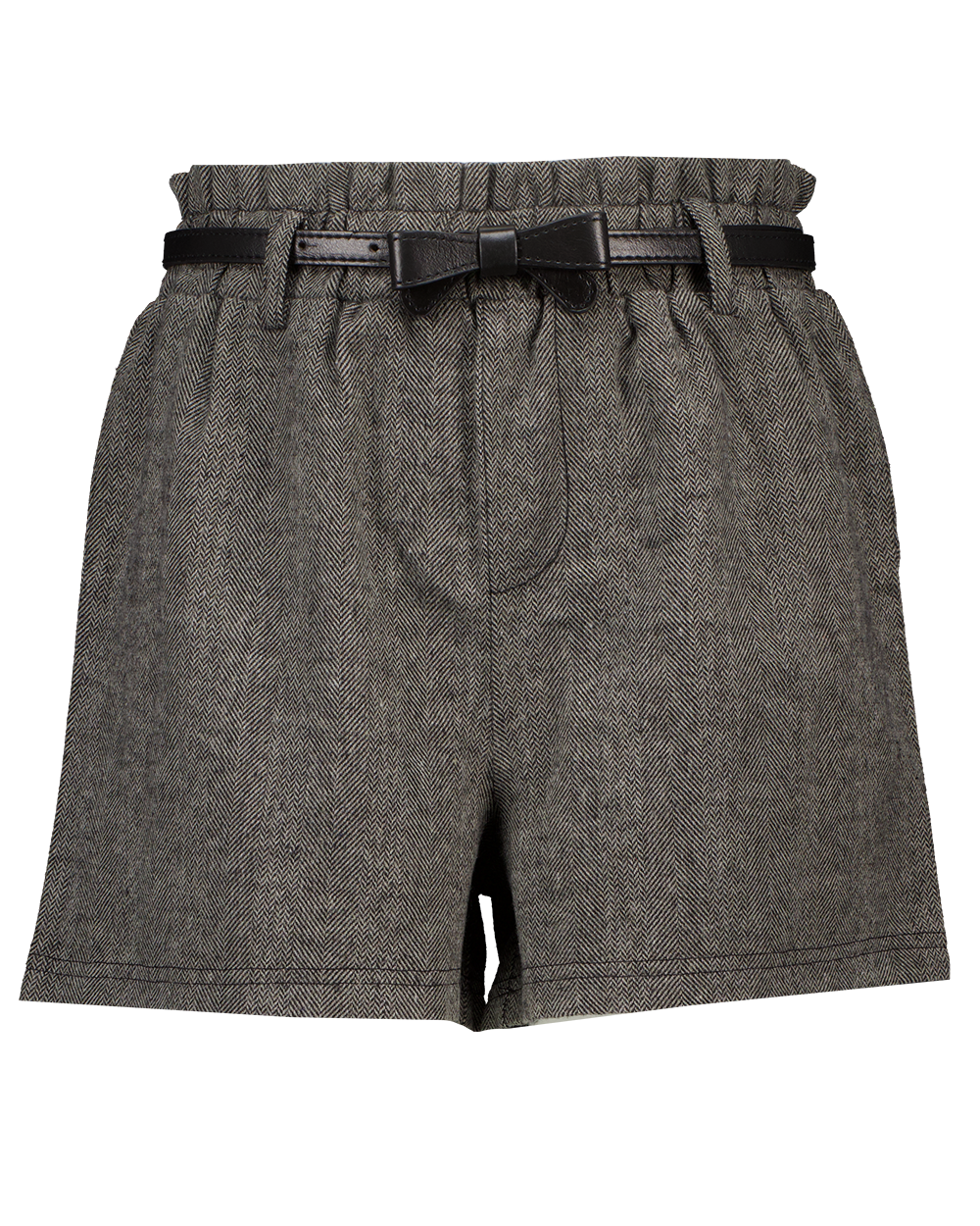 Deze zwarte korte broek voor meisjes heeft een elastische tailleband met een subtiel ruche-effect. De smalle, afneembare riem met strik zorgt ervoor dat de broek goed blijft zitten. De stof heeft een licht gemêleerde uitstraling. De rechte, losse broekspijpen bieden extra comfort. Ideaal voor dagelijks gebruik en makkelijk te combineren met verschillende tops.