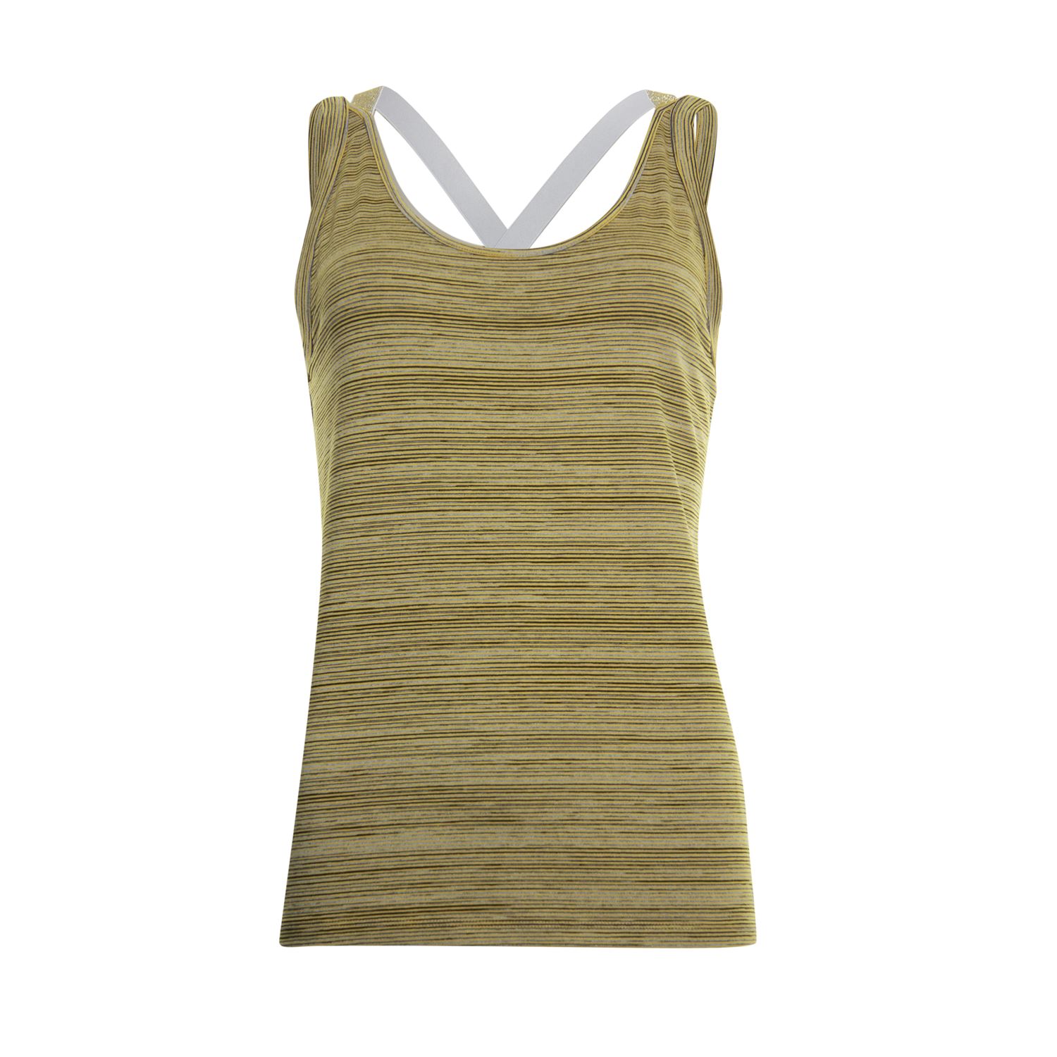 Singlet met streepjes print. Het singlet is voorzien van een dubbel bandje waarvan 1 in goudkleurig elastiek dat achter op de rug gekruisd is.
