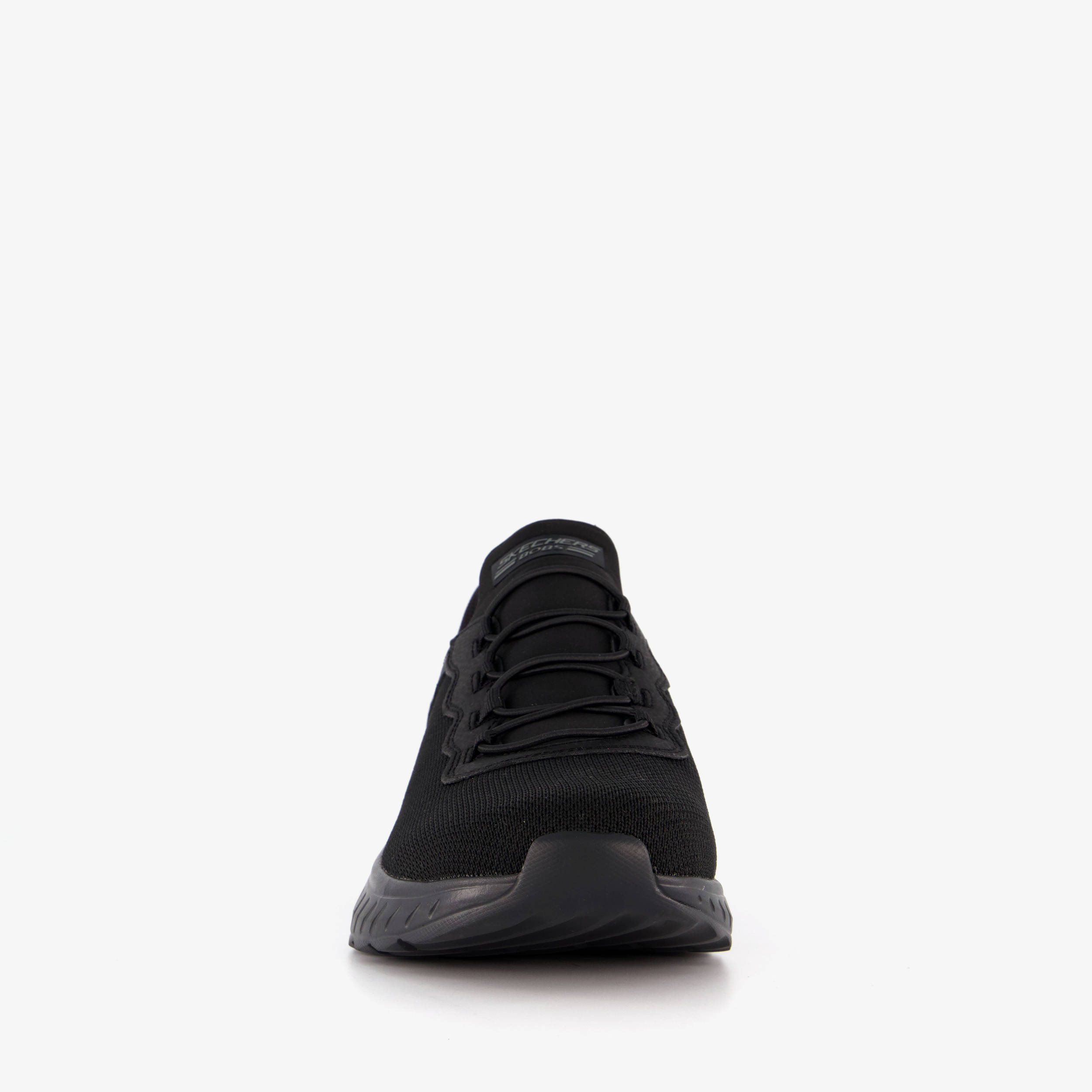 Zwarte heren bob squad slip-ins van skechers. Het ademende bovenwerk is gemaakt van mesh, het binnenwerk van textiel en de flexibele profielzool van rubber. De sneakers zijn voorzien van Exclusive Heel Pillow™-voering die je hielen omsluit en stevig op hun plek houdt, plus een schokabsorberende middenzool. Daarnaast hebben de schoenen een binnenzool met Memory Foam voor extra demping en comfort. De sneakers zijn gemaakt van 100% vegan materialen.