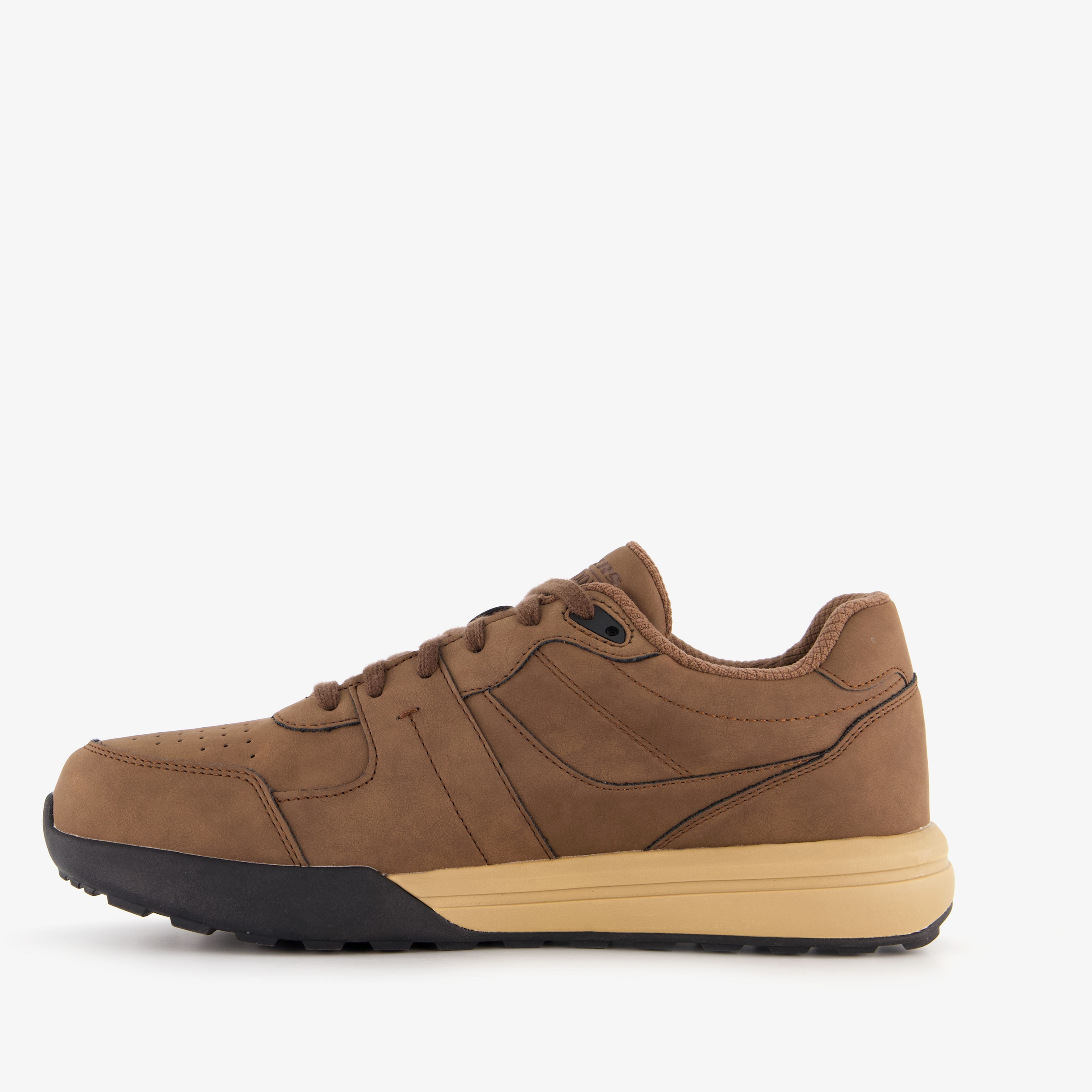 Bruine Skechers veterschoenen voor heren. Het buitenwerk is gemaakt van imitatieleer, het binnenwerk van textiel en de stevige zool met profiel van rubber. Voorzien van een vetersluiting en een uitneembare binnenzool. Deze bevat Air-Cooled Memory Foam wat demping en comfort biedt. De schoenen zijn gevoerd en waterdicht.