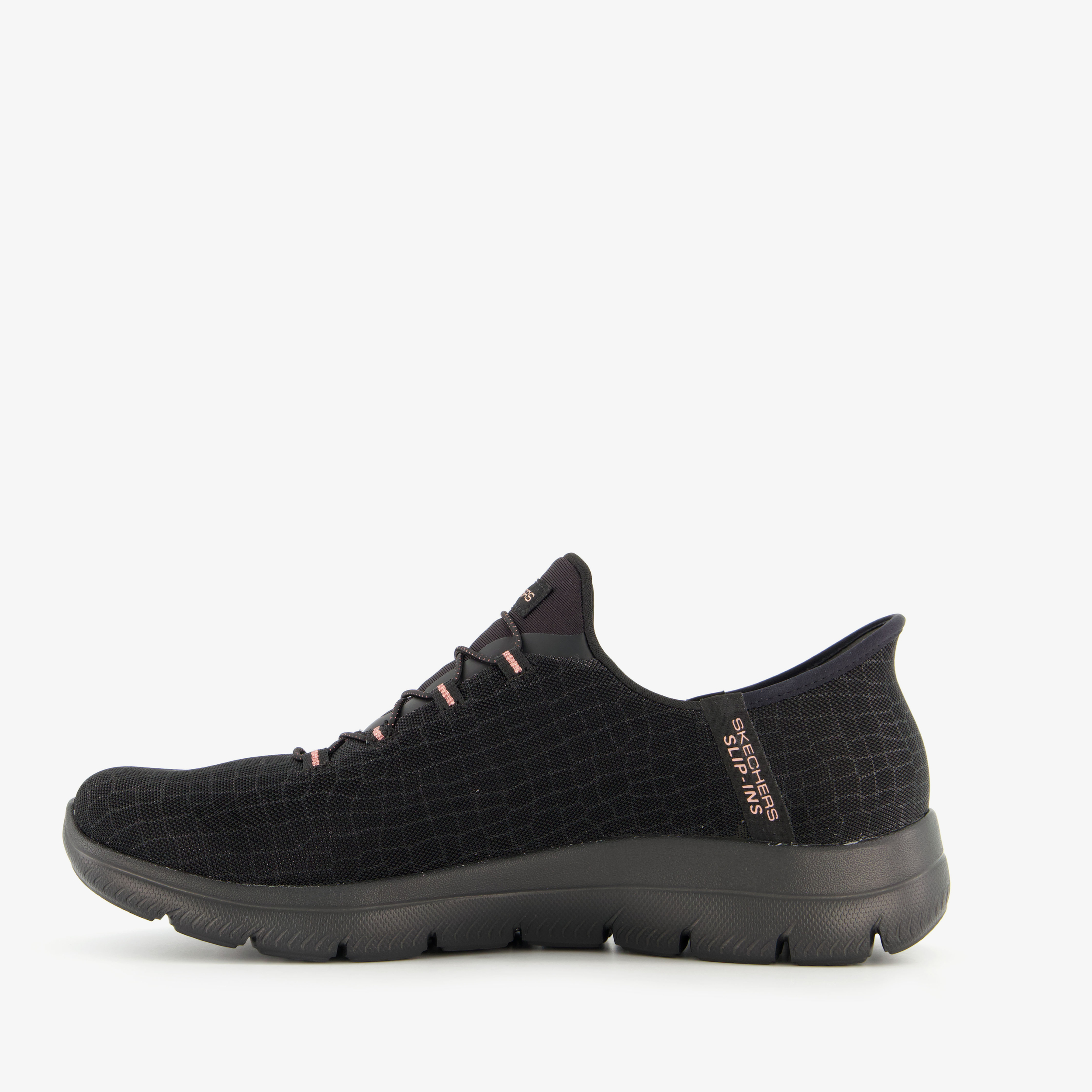 Zwarte Skechers Slip-Ins: Summmits Classy Night Black Gold sneakers voor dames. Gemaakt van textiel met een binnenwerk van textiel en een rubberen profielzool. Voorzien van de Skechers Hands Free Slip-ins® technologie voor een comfortabele pasvorm en makkelijke instap. De Exclusieve Heel Pillow™ houdt je voet stevig op zijn plaats. De sneakers hebben een comfortabele binnenzool met Skechers Air-Cooled Memory Foam®-demping en een lichtgewicht, flexibele schokabsorberende tussenzool. Op het bovenwerk is subtiel glinsterende slangenprint aangebracht.