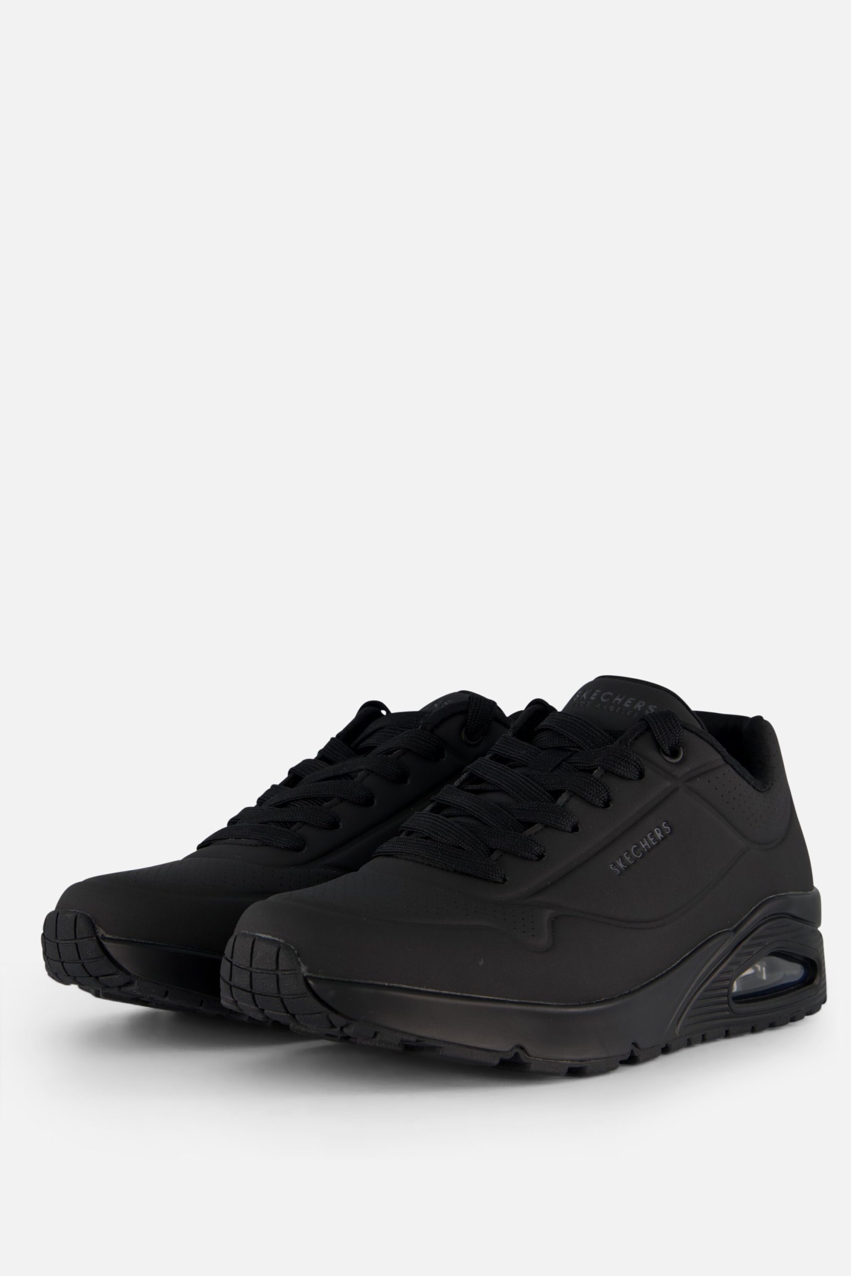 Sportieve zwarte Skechers Uno Stand On Air sneakers, gemaakt van imitatieleer. De comfortabele binnenzool en de voering zijn gemaakt van hetzelfde materiaal. De sneakers worden gesloten door middel van een vetersluiting. Dankzij het dempende voetbed met Memory Foam lopen de schoenen extra comfortabel. Goed om te weten: het voetbed van deze Skechers Uno Stand On Air sneakers is niet uitneembaar.
