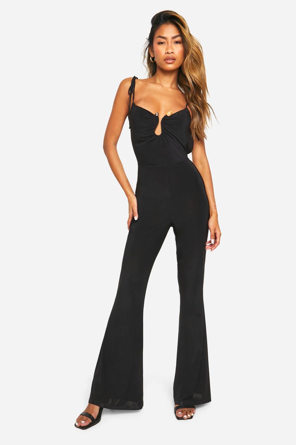 Maak kennis met je nieuwste garderobe-essential: deze jumpsuit met wijde pijpen. Met zijn klassieke snit die je benen verlengt en je taille accentueert, staan jumpsuits met uitlopende pijpen bekend om het flatteren van je rondingen. Compleet met geplooide mouwen, gedurfde uitsnijdingen en fraaie tie-details, is onze collectie super praktisch en perfect voor warmer weer. Van klassieke zwarte modellen tot wijde denimjumpsuits, we hebben voor elke stijl iets passends. Houd het simpel met chunky sandalen of ga van dag naar nacht met bijna onzichtbare hakken. Stijl: Jumpsuit met wijde pijpen Stof: Slinky Lengte: Regular Mouwlengte: Bandjes Modellengte: 173 cm / 5’8″ boohoo Dames Slinky Open Back Gerimpelde Billen Jumpsuit | Black | Maat: 42