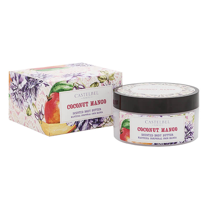 Body butter uit de Smoothies collectie van het Portugese merk Castelbel. De Coconut Mango body butter is geparfumeerd met de opwindende geur van exotische, zoete mango in combinatie met kokosnoot. Deze rijke body butter smelt op de huid en trekt snel in. Het resultaat is een heerlijk zachte en gladde huid die intensief gevoed en gehydrateerd is.