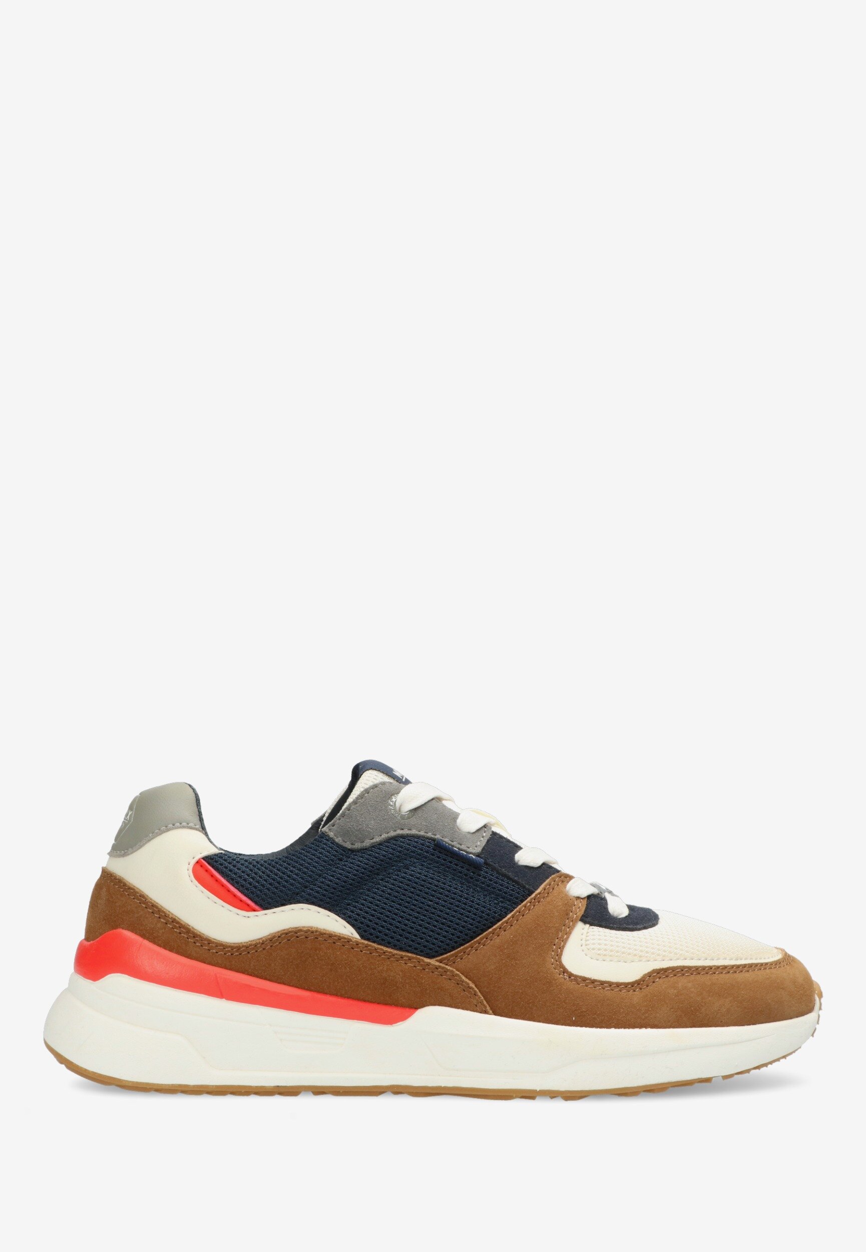 Sporty sneaker for men from Mexx. The sneaker is made in the colors: cognac, dark blue and off white with orange/red details. Made of suede, mesh and imitation leather. Subtle Mexx logo on the back. Easy to combine. Spray the sneakers regularly against water and dirt.