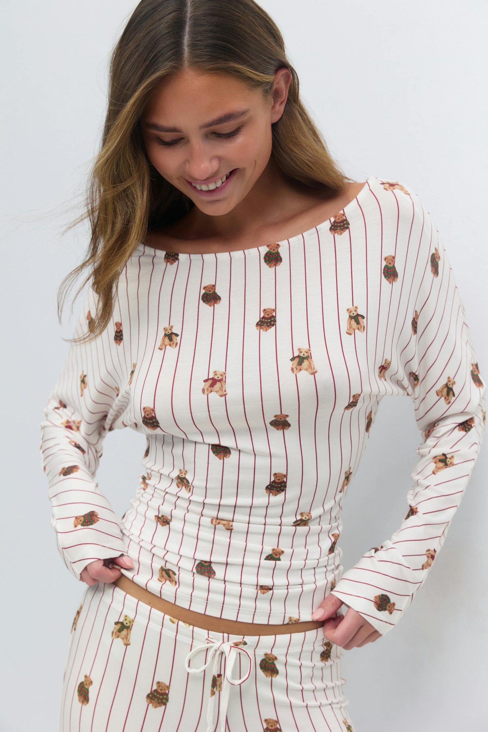 Gestreept pyjamabovenstuk met smalle teddyberen. Het topje is met lange mouwen en heeft boot halslijn. Het heeft zachte kwaliteit, ruimvallende stijl aan de bovenkant en nauwsluitend taille.