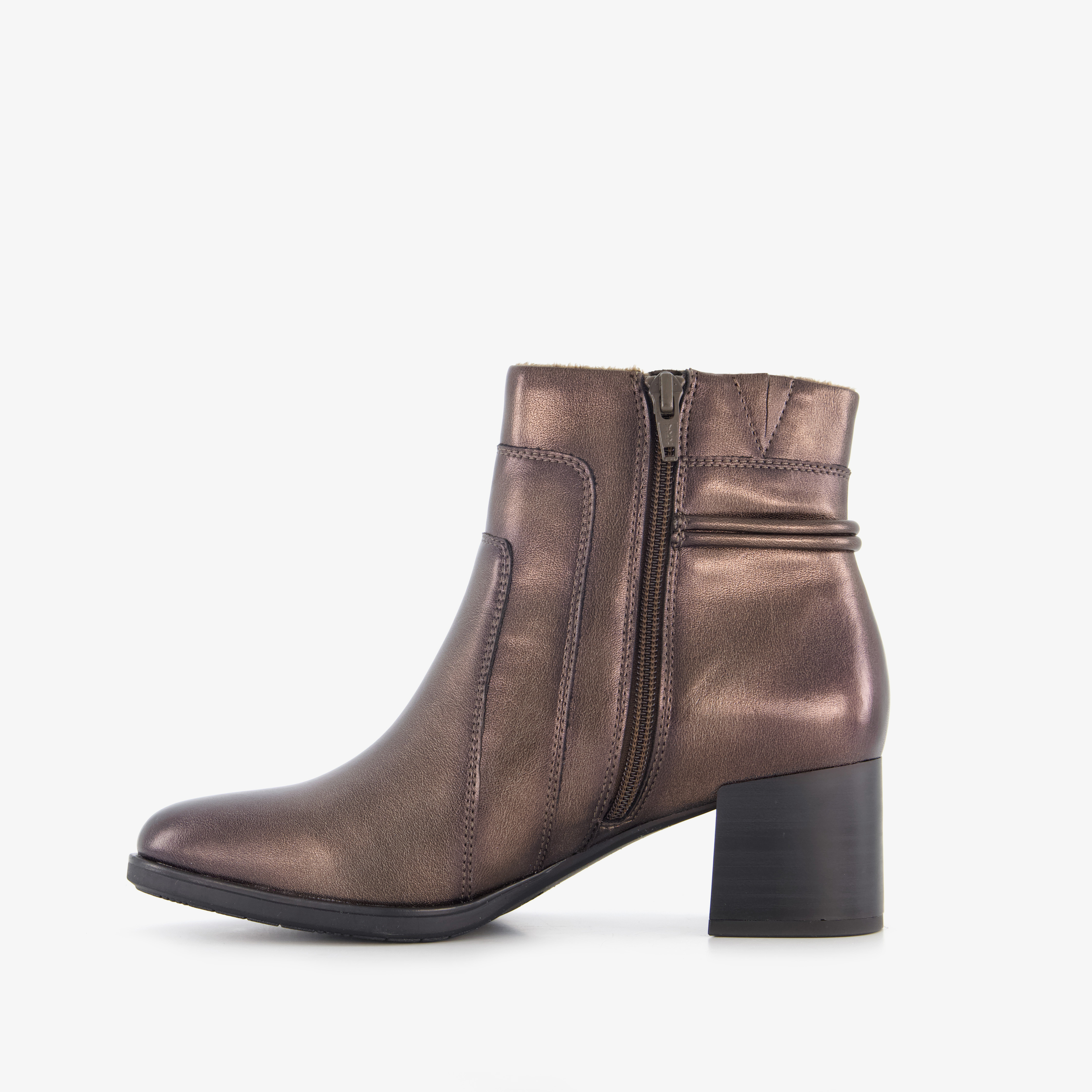 Bronskleurige haklaarsjes van Nova. Met een boven- en binnenwerk van imitatieleer en een stevige zool. De enkellaarsjes hebben een rits aan de binnenzijde en uitneembaar voetbed van textiel. Door de H-leest zijn de laarsjes geschikt voor brede(re) voeten omdat er meer ruimte is bij de voorvoet. Voorzien van een schachthoogte van 13 cm en een blokhak van 5,5 cm.