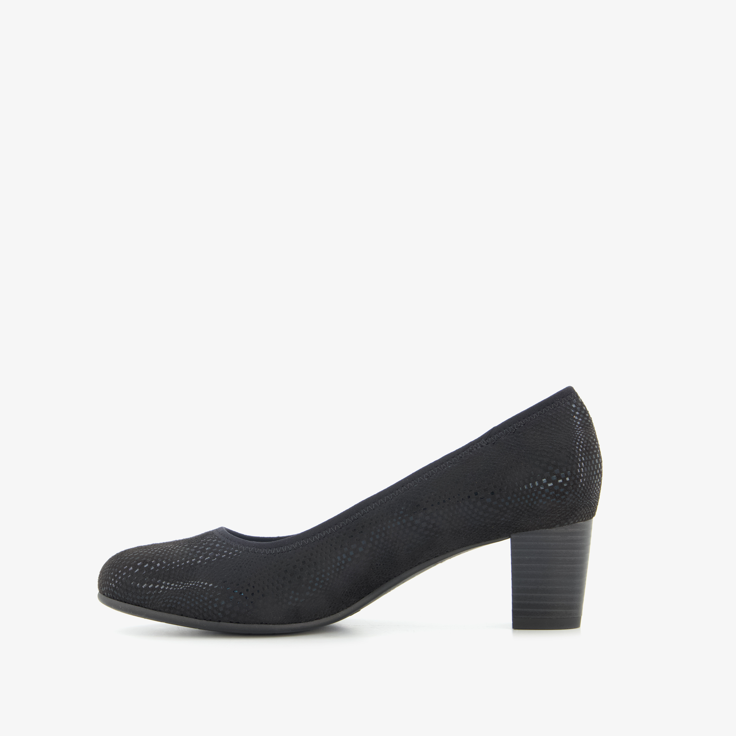 Zwarte pumps voor dames met H-leest. Gemaakt van textiel en imitatieleer, een binnenwerk van textiel en een stevige zool. De pumps hebben een ronde neus, vast voetbed van imitatieleer en subtiel croco dessin op het bovenwerk. Voorzien van een H-leest waardoor de pumps geschikt zijn voor brede(re) voeten. De pumps hebben een blokhak van 5 cm.