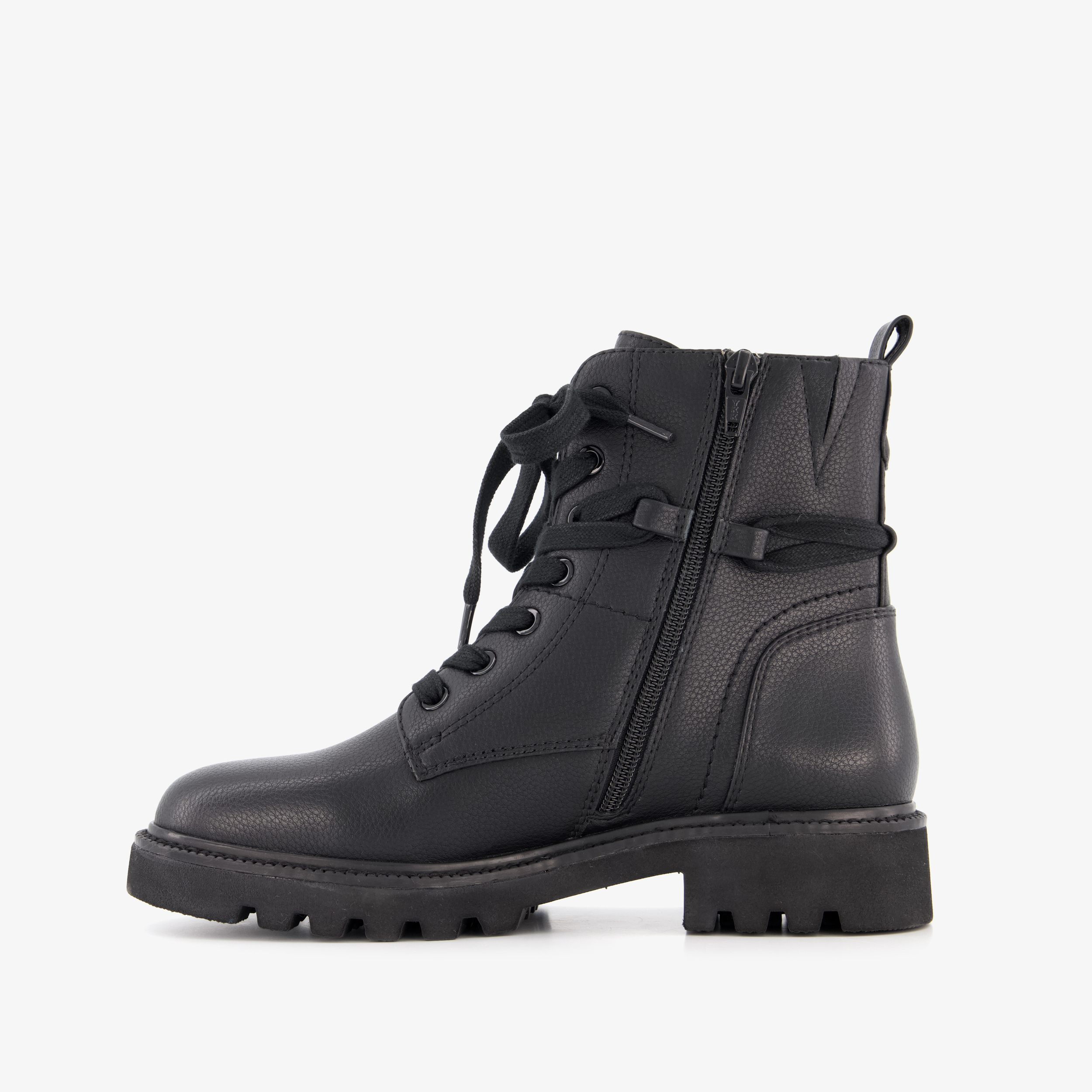 Zwarte veterboots voor dames van Softline. Het buitenwerk en het binnenwerk zijn gemaakt van imitatieleer, en de stevige buitenzool met profiel is van rubber. De binnenzool is van synthetisch materiaal en niet uitneembaar. De boots zijn voorzien van een vetersluiting, een rits aan de binnenkant en veters om de schacht. Ze hebben een brede pasvorm, een aantreklusje aan de achterkant en de schachthoogte is 15 cm.
