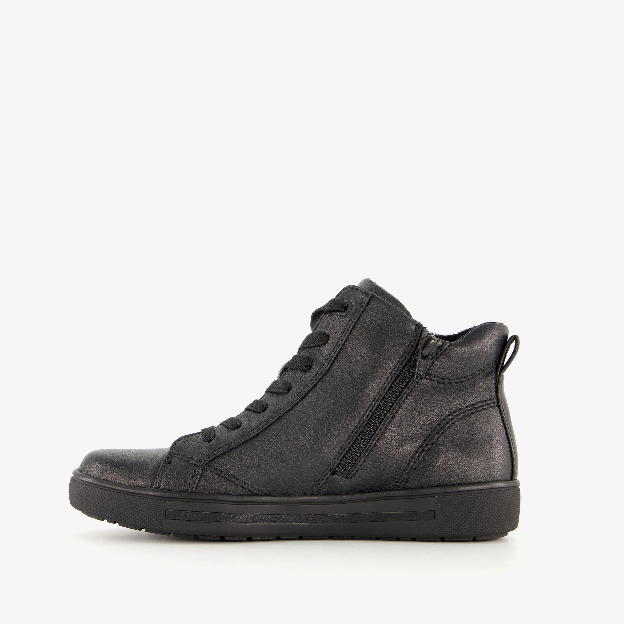 Hoge, zwarte sneakers voor dames van Softline. Het buiten- en binnenwerk zijn gemaakt van imitatieleer en de buitenzool is van rubber. Voorzien van een vetersluiting, een rits aan de binnenzijde, een rits aan de buitenzijde en hiellusjes. Het comfortabele voetbed van textiel is niet uitneembaar. De sneakers hebben een brede pasvorm.
