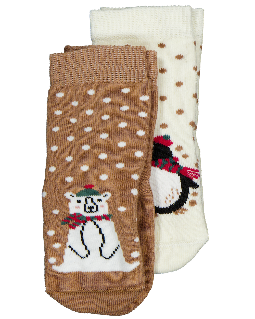 Set van twee paar babysokken in bruin en offwhite. Beide sokken hebben een patroon van stippen en een dierfiguur, zoals een ijsbeer met een muts en sjaal en een pinguïn met sjaal. De sokken zijn zacht afgewerkt, waardoor ze comfortabel en warm aanvoelen aan de voetjes van baby's. Ideaal voor dagelijks gebruik en om de voetjes lekker warm te houden.