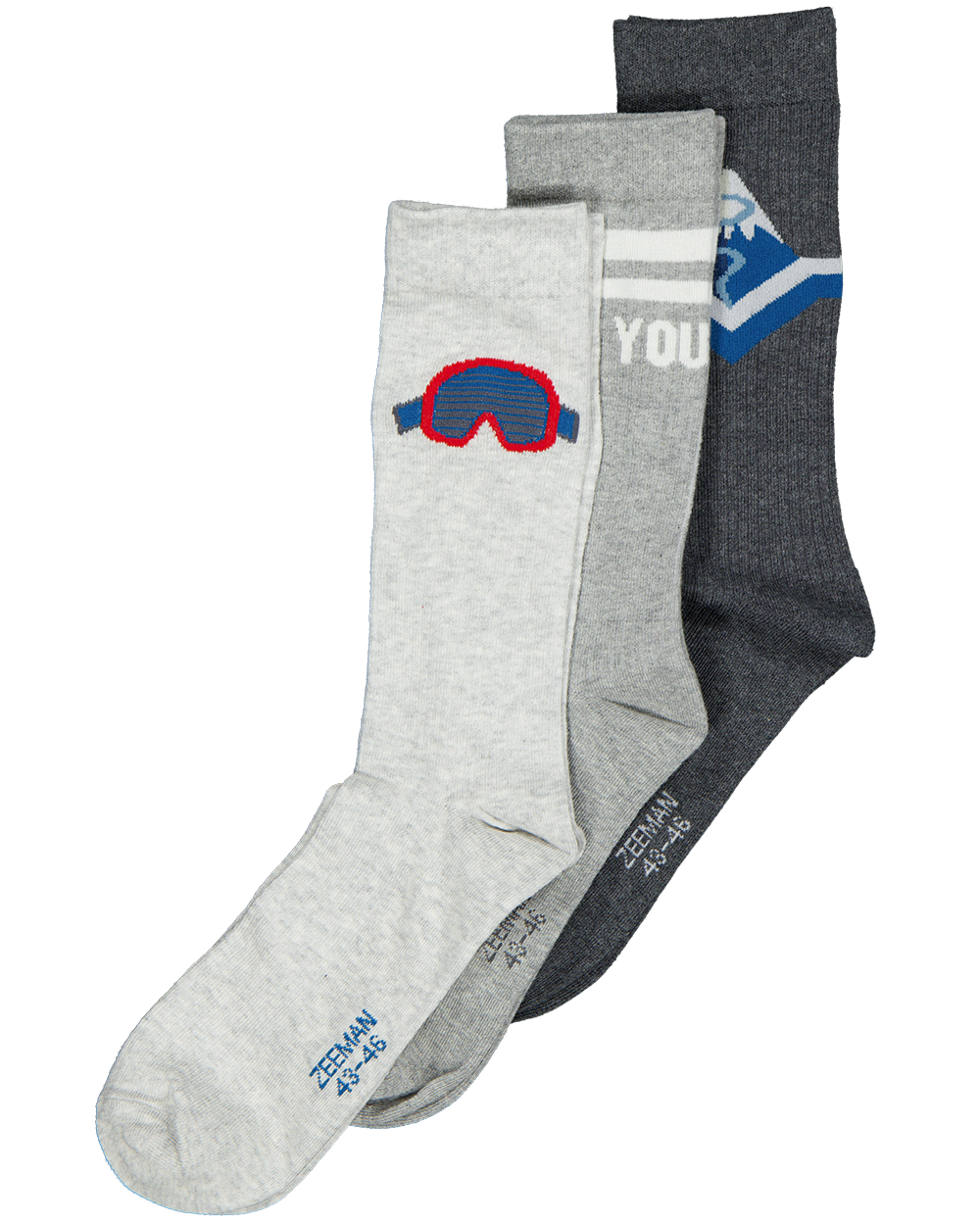 Set van drie heren sokken in verschillende grijstinten. Eén paar heeft een sportief detail, het tweede paar is voorzien van witte strepen en een tekst, en het derde paar is effen met een subtiel kleuraccent. De sokken zijn gemaakt van katoen, polyester en elastaan en bieden een comfortabele, rekbare pasvorm. Geschikt voor dagelijks gebruik en prettig in verschillende schoenen.