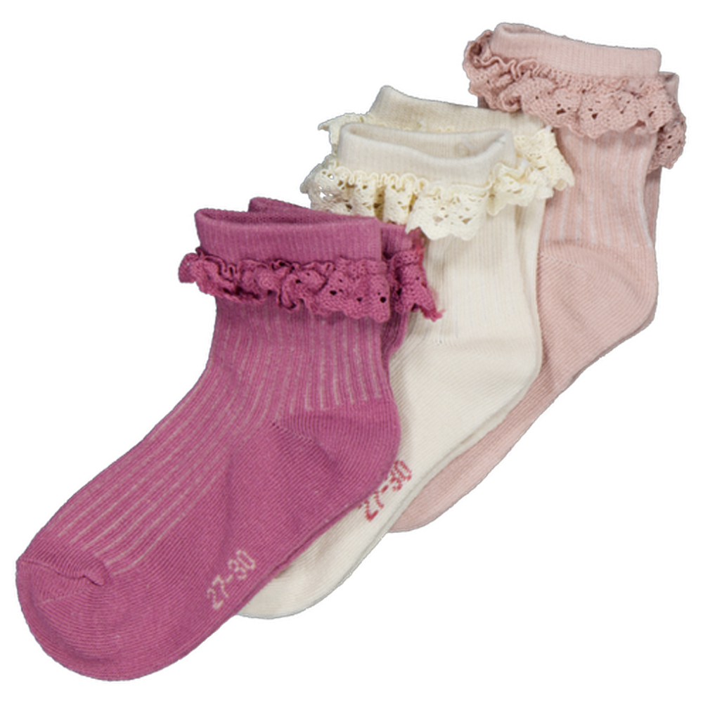 Deze set bevat 3 paar sokken voor jongens en meisjes in roze, wit en lichtroze. De sokken hebben een kanten rand aan de bovenkant. Dankzij de mix van katoen, polyester en elastaan voelen ze zacht aan en sluiten ze goed aan op de voet. Geschikt voor verschillende soorten schoenen. Ideaal voor dagelijks gebruik door het comfortabele draagcomfort.