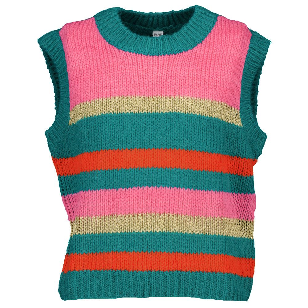 Deze meisjes spencer heeft opvallende brede strepen in de kleuren roze, groen, lichtgeel, oranje en blauwgroen. De ronde hals en boorden zijn grofgebreid, waardoor de spencer stevig aanvoelt. De samenstelling van acryl en polyamide zorgt voor een zachte en licht elastische stof, zodat je deze spencer prettig over een shirt of blouse draagt tijdens koudere dagen.