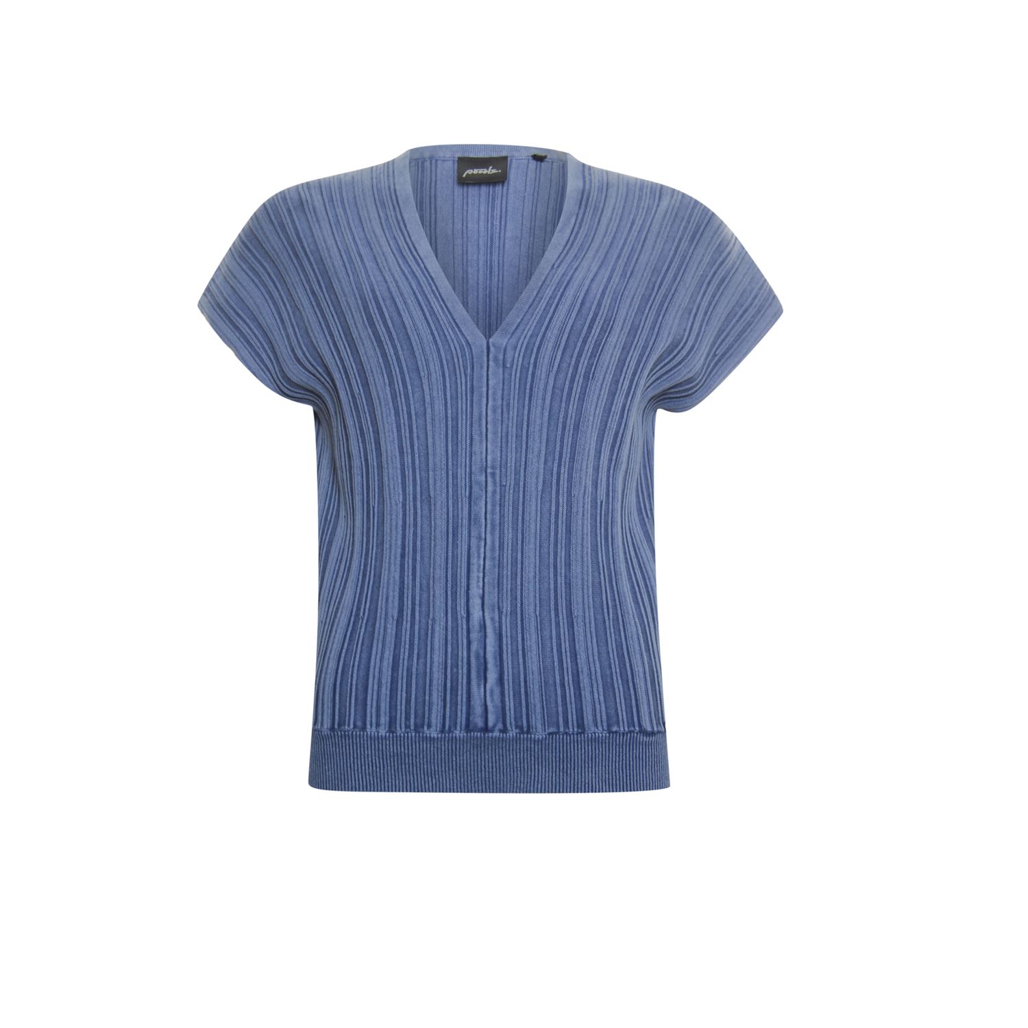 Mouwloze trui in katoen. Deze trui heeft een gewassen look, V -hals en is gebreid in een rb.