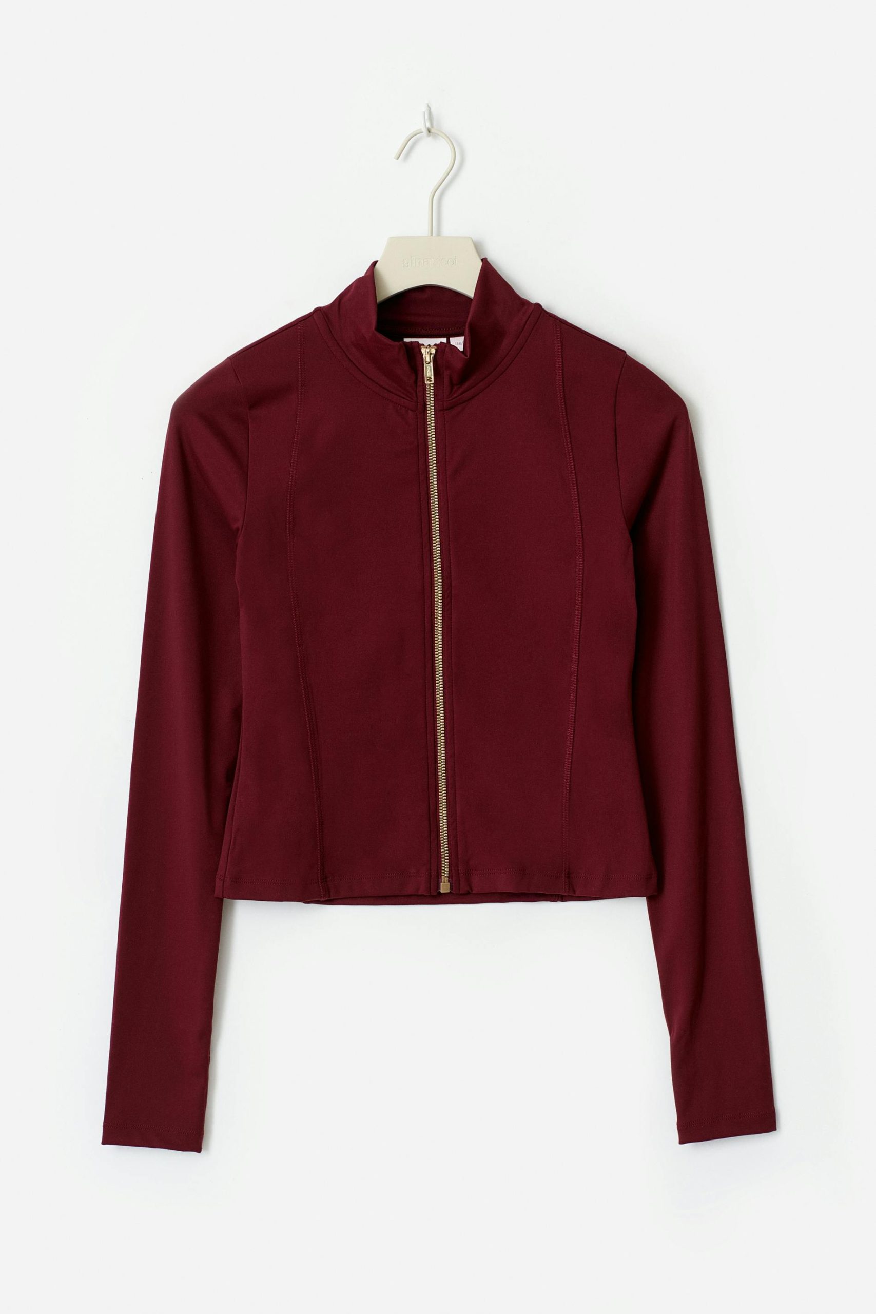 Sportieve jas van tricot met duimgaten. De jas is wijnrood en heeft rits aan de voorkant. Het heeft vochtafvoerende functie, nauwsluitende pasvorm, lange mouwen en zachte en elastische kwaliteit.