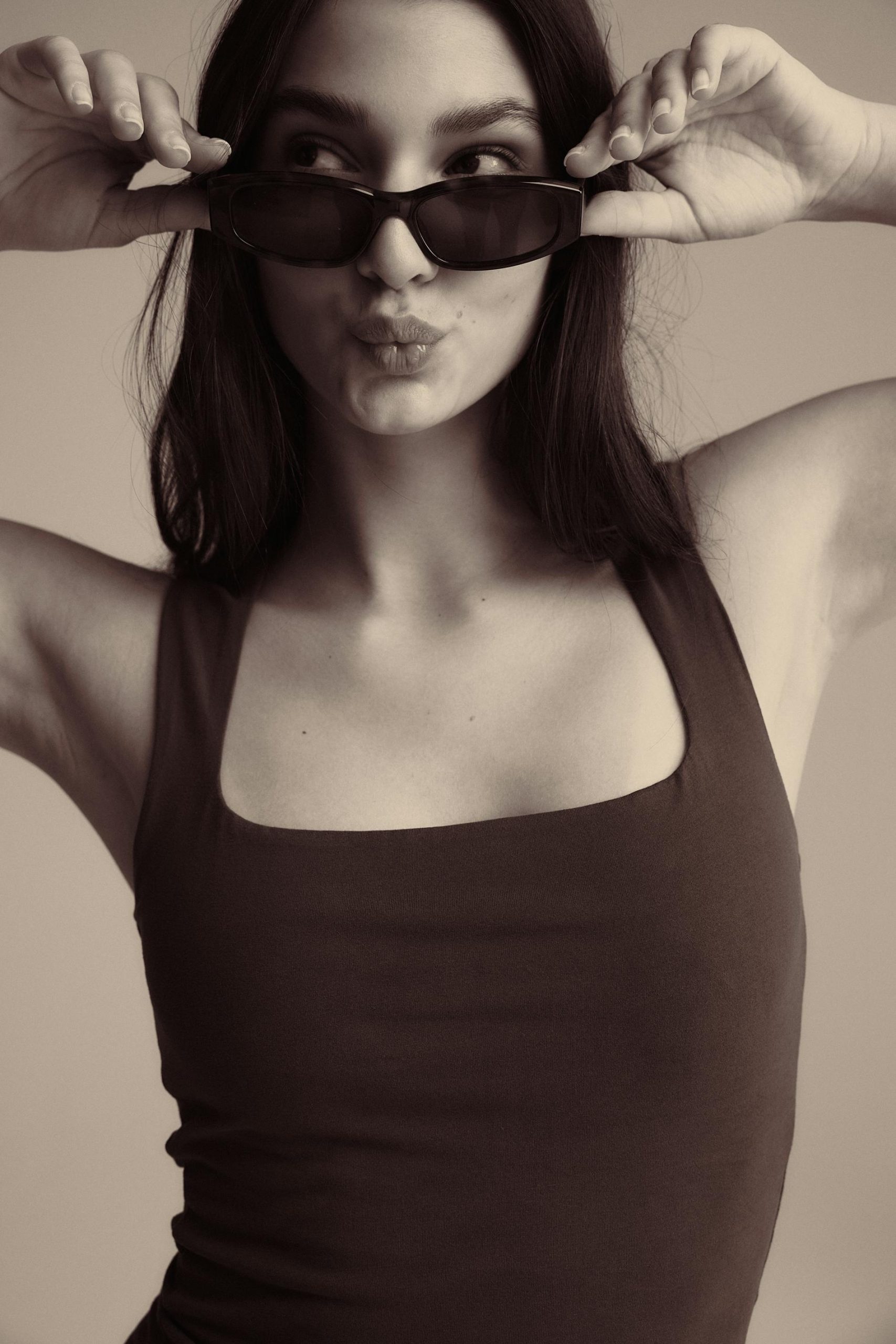 Tank met vierkante halslijn. De tank is wijnrood en heeft nauwsluitende pasvorm. Het heeft gevoerde buste, brede schouderriemen en afgesneden lengte.