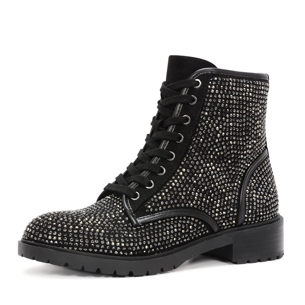 Steve Madden Ozzy Ankeboot, model SM11000131 is een stoere biker boot gemaakt voor glamour girls! De sparkelende strass steentjes bedekken het materiaal van dit traditionele veterlaarsje en zorgen voor een extra dimensie en een showstopping fashion statement! Van binnen is de boot comfortabel gevoerd met textielstof en is aan zijkant voorzien van een handige ritssluiting. De rubberen zool is voorzien van een grof profiel met anti-slip. Deze Steve Madden veterboots zijn afkomstig uit de nieuwste FW collectie 2019-2020.