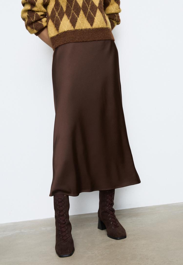 Stradivarius Falda midi zijdeachtig Bruin XL