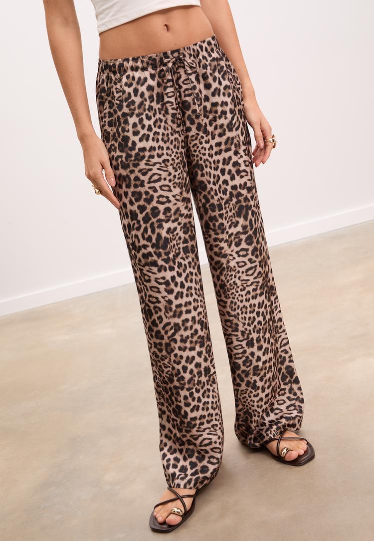 Soepelvallende broek van een zijdeachtige stof. Normale taille en een elastische tailleband die verstelbaar is met koordjes. Zijzakken. Wijde pijpen. Verkrijgbaar in verschillende kleuren.