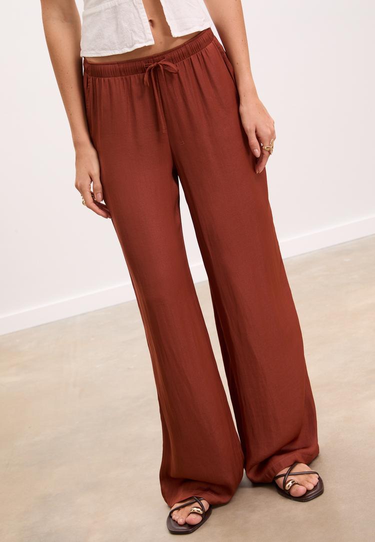 Soepelvallende broek van een zijdeachtige stof. Normale taille en een elastische tailleband die verstelbaar is met koordjes. Zijzakken. Wijde pijpen. Verkrijgbaar in verschillende kleuren.