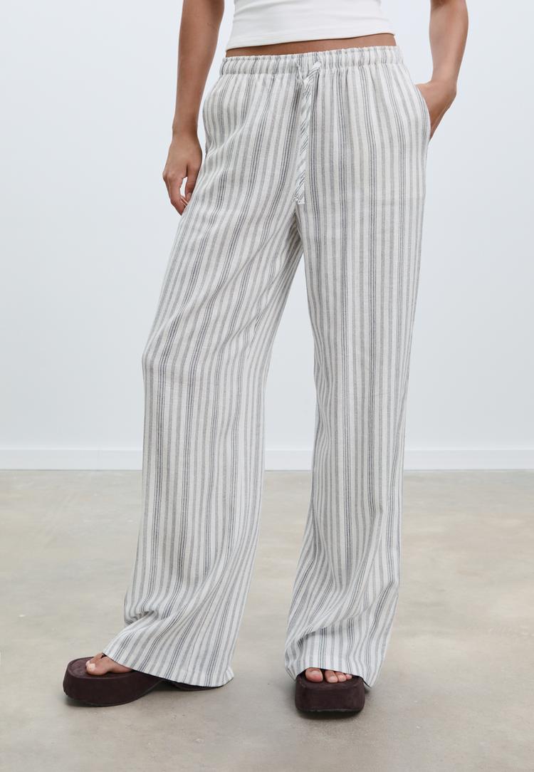 Lange, zwierige broek gemaakt van stof met linnenlook. Elastische tailleband verstelbaar met bijpassende koorden. Zakken aan de zijkanten. Rechte, wijde pijpen. Verkrijgbaar in verschillende kleuren.