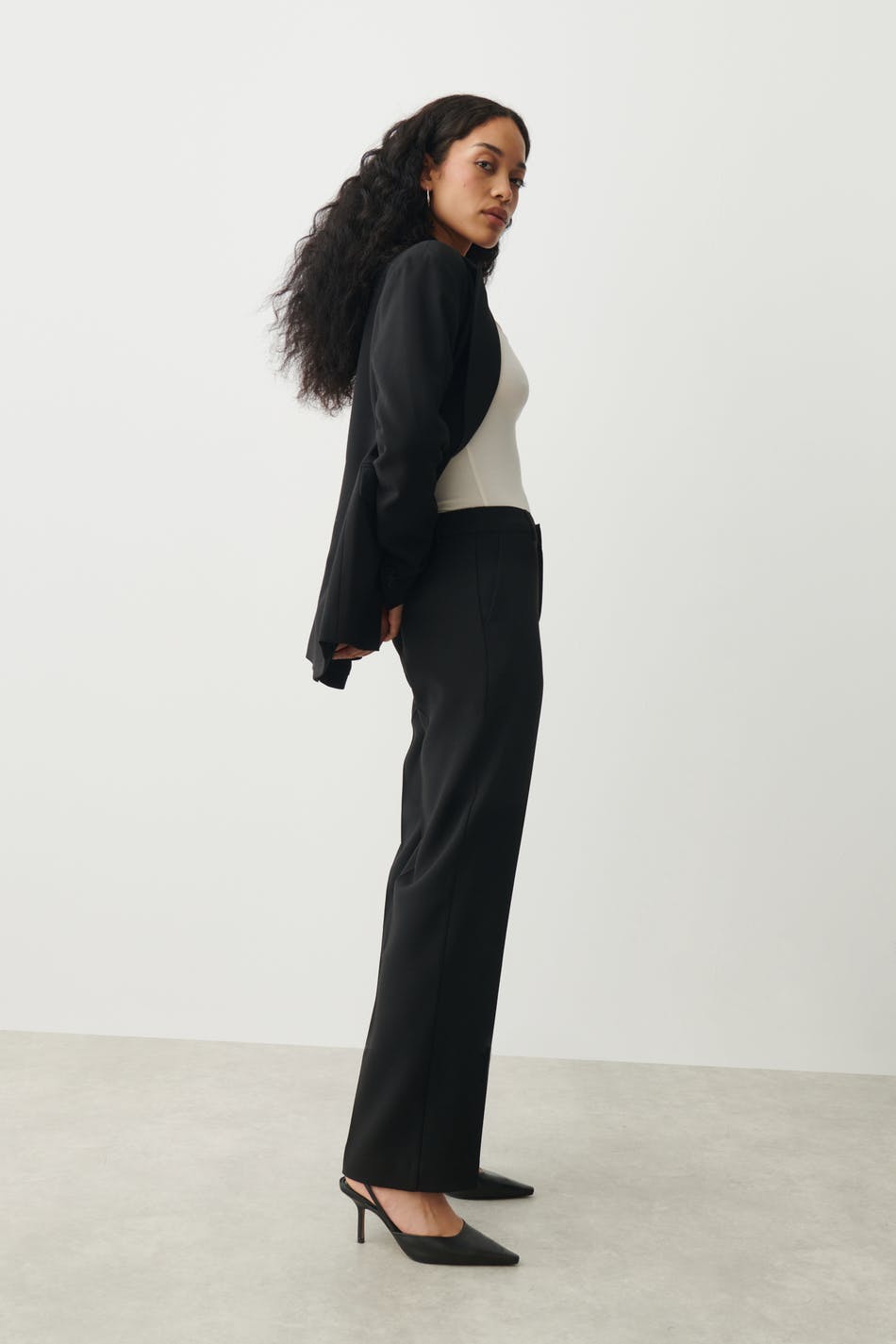 Pantalonnen met zakken aan de zijkanten. De broeken zijn zwart en hebben vouw aan de voorkant. Het heeft lange broekspijpen en een paspelzak achter.