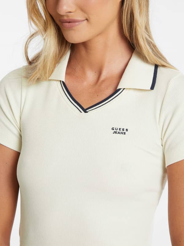 Een slim fit T-shirt, geribd voor een nauwsluitende pasvorm, met geborduurde details. Gemaakt met onze biologische katoenmix.Gebreide geribde polo.Split hals met gevouwen kraag; Korte mouwen.Geborduurd logo op de borst.Slim fit en normale lengte.Gestreepte randen.
