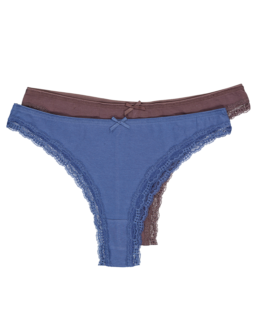 Deze blauwe damesonderbroek heeft een kanten detail van polyamide en elastaan. Het katoen met elastaan zorgt voor comfort en een perfecte pasvorm. De kanten randen geven extra elegantie aan het ontwerp. Je ontvangt twee stuks in verschillende kleuren.