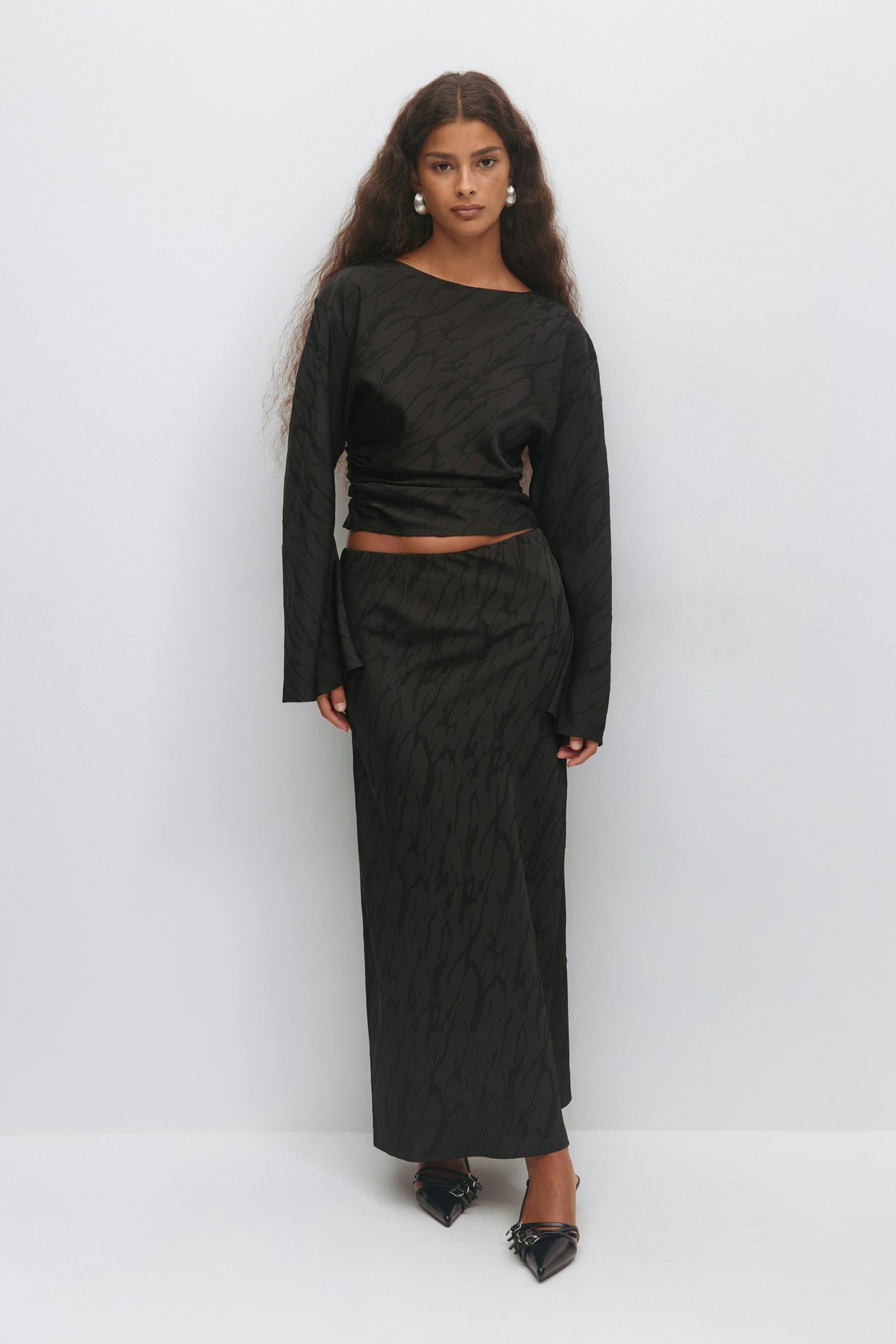 Gestructureerde maxirok met elastiek aan de taille. De rok is zwart en heeft normale pasvorm. Het heeft maximale lengte en midden taille.