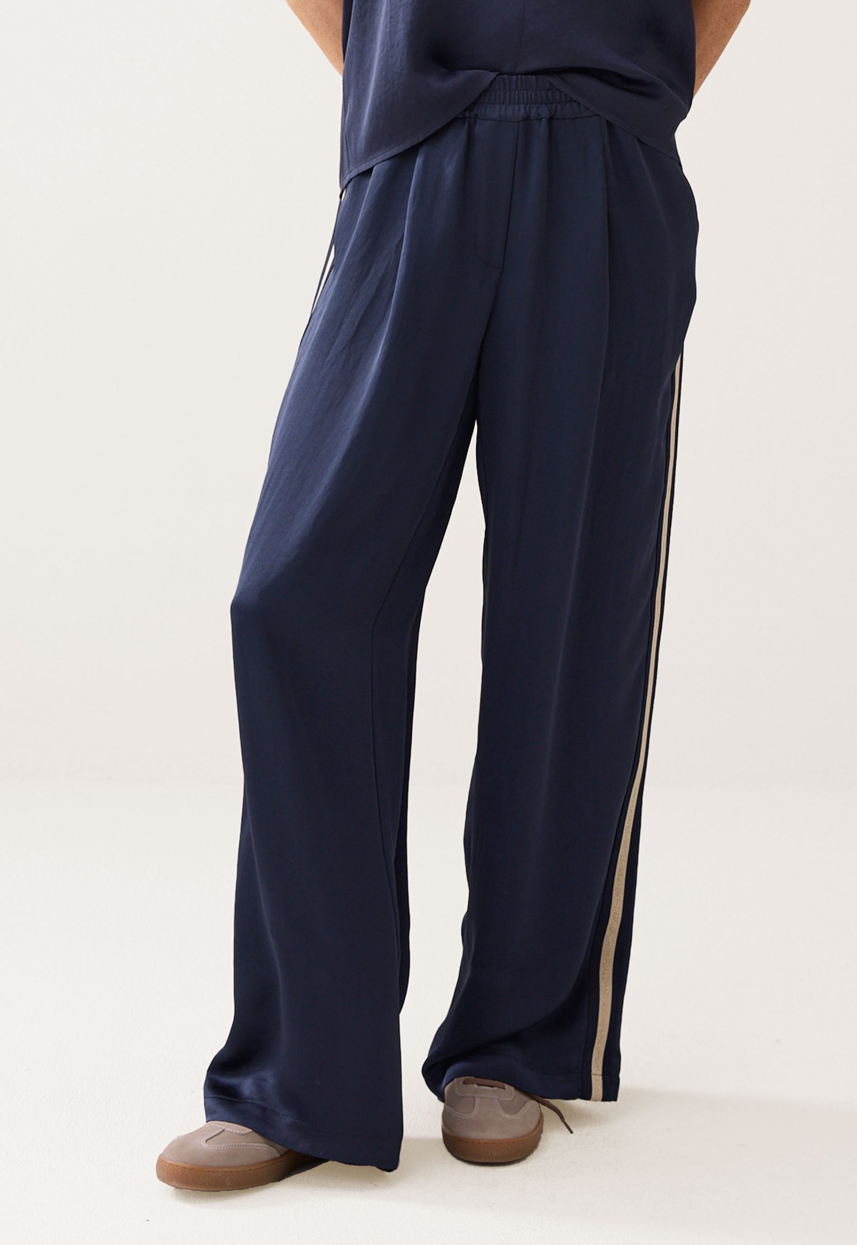Dit is de 4S2866-12084C6 Heavy Silkytouch broek van het merk Summum. Deze soepel vallende broek heeft een wide leg fit en is gemaakt van een luxe glanzende stof. Verder heeft de broek een elastische tailleband met koord en een contrastbies langs de zijnaad. De broek heeft rechte steekzakken voor fijn draagcomfort.
