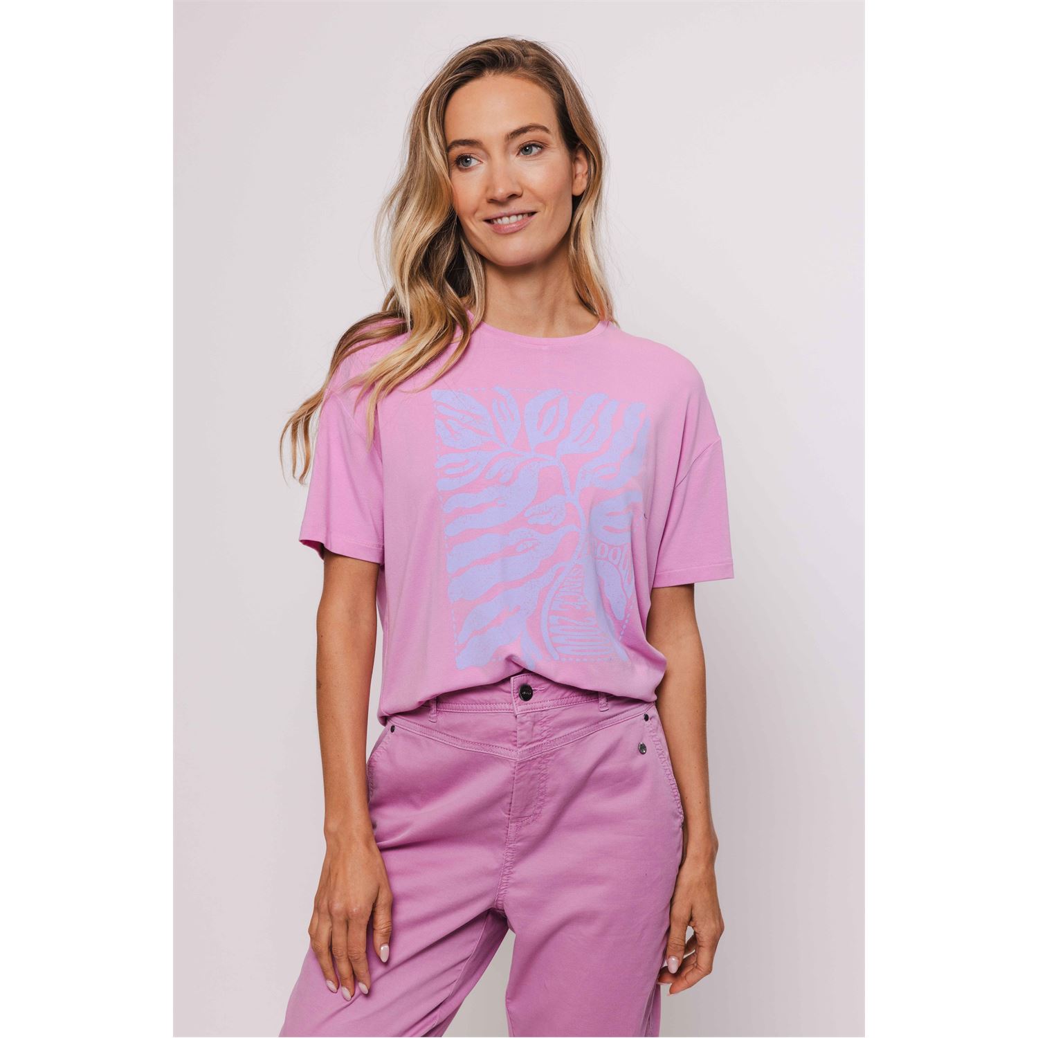 los vallend katoenen T-shirt met print opdruk en hoog gesloten ronde hals.