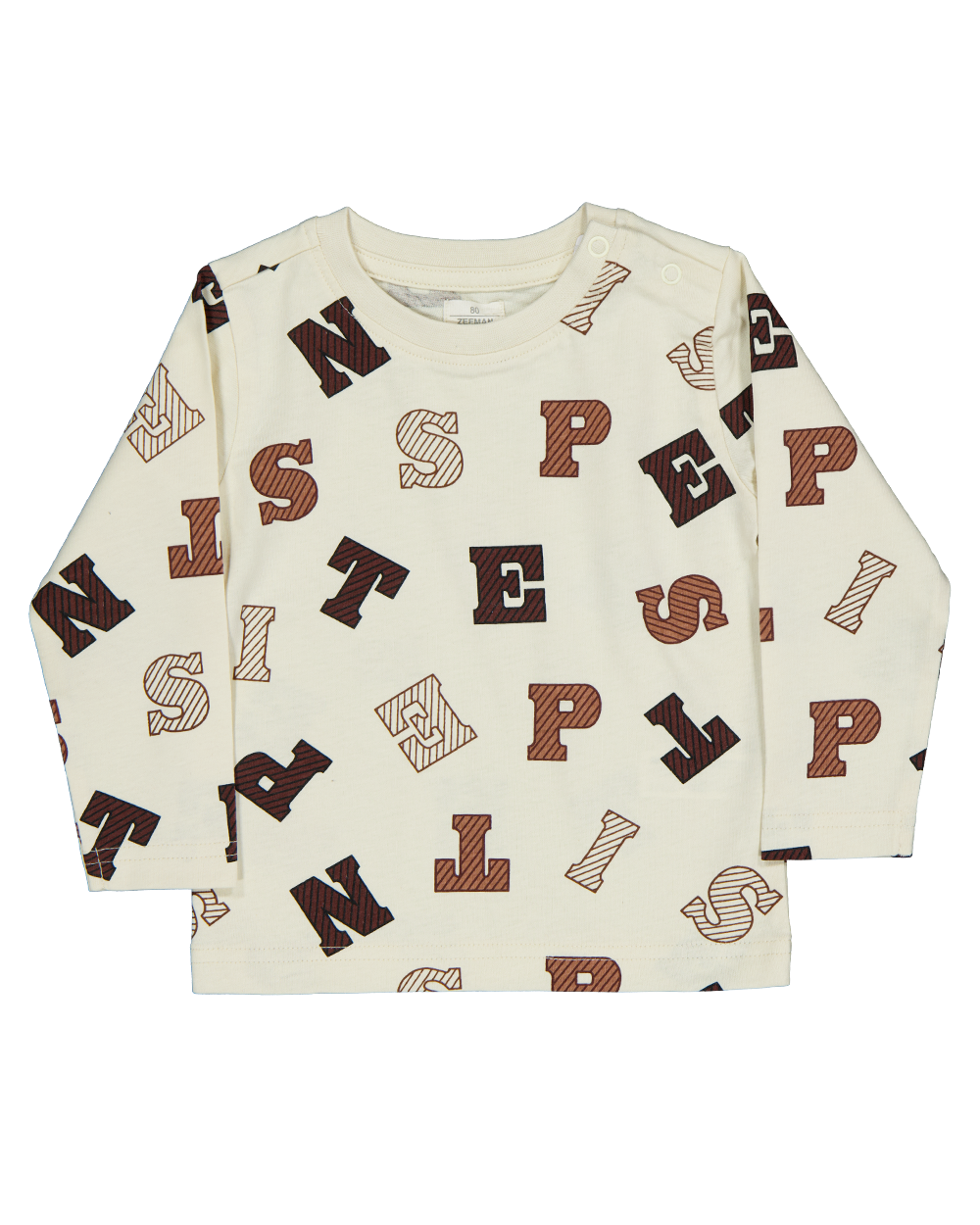 Deze beige baby T-shirt is gemaakt van 100% katoen. De zachte en ademende stof zorgt ervoor dat je baby zich prettig voelt en vrij kan bewegen. Het shirt heeft lange mouwen en een vrolijke print in bruine en beige tinten. Geschikt om te dragen tijdens het spelen of slapen, zodat je baby comfortabel blijft, de hele dag door.