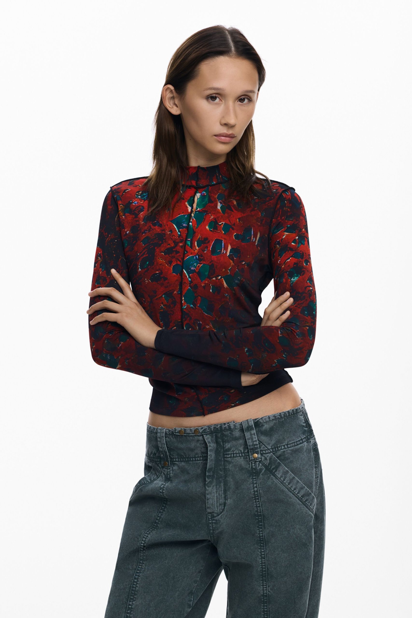 Langarmshirt, regular fit, decoratieve stiksels en bladprint met herfstinspiratie.