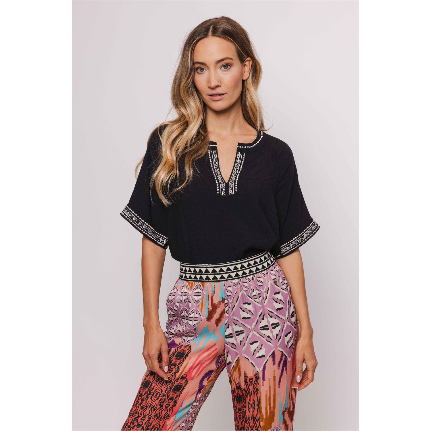 Prachtige blouse met borduur details. Gemaakt van luchtige viscose mix kwaliteit. Ronde hals met split en korte raglan mouw.