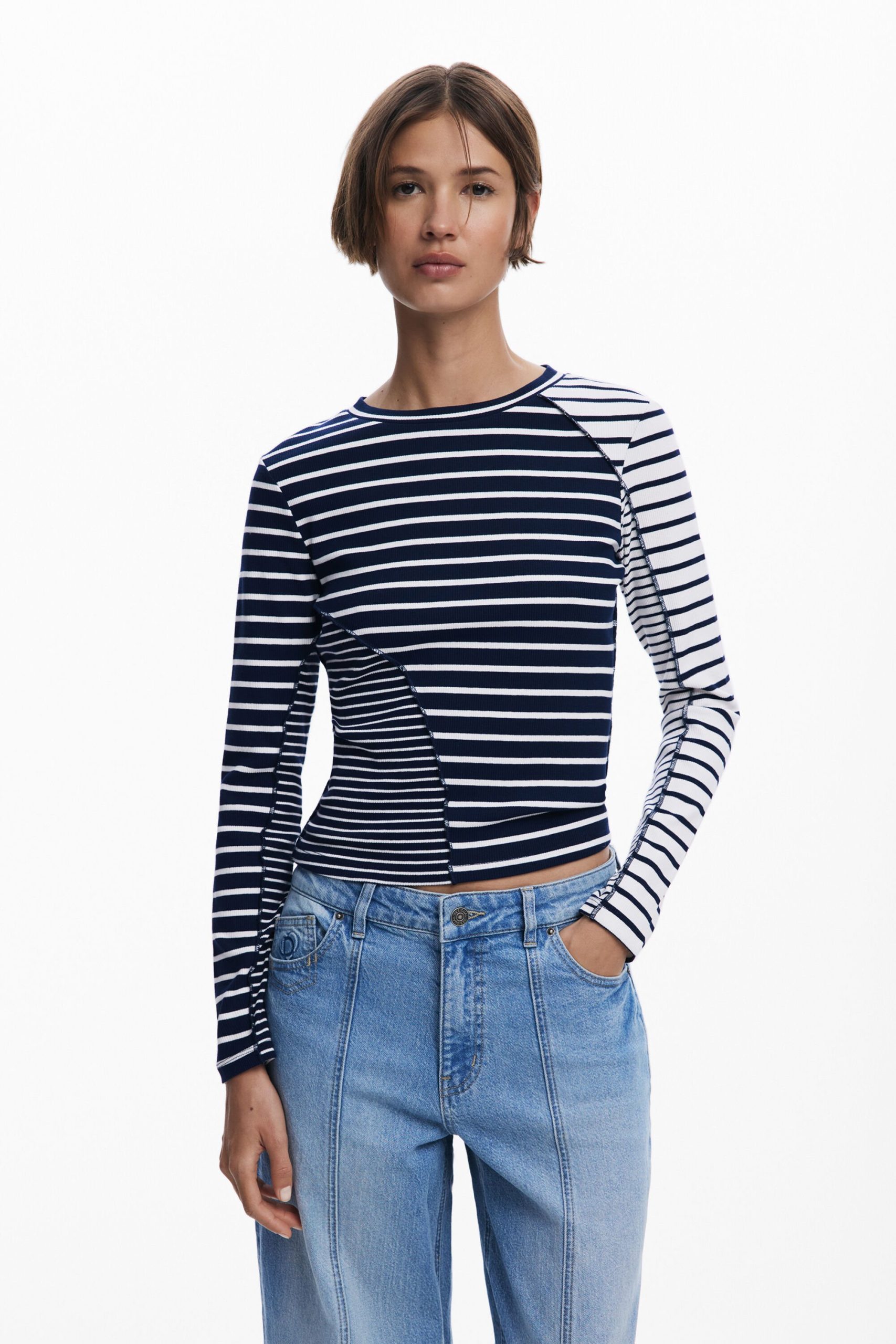 Lange mouwen T-shirt met ronde hals met verschillende strepenprints gecombineerd met patchwork en zichtbare naden.