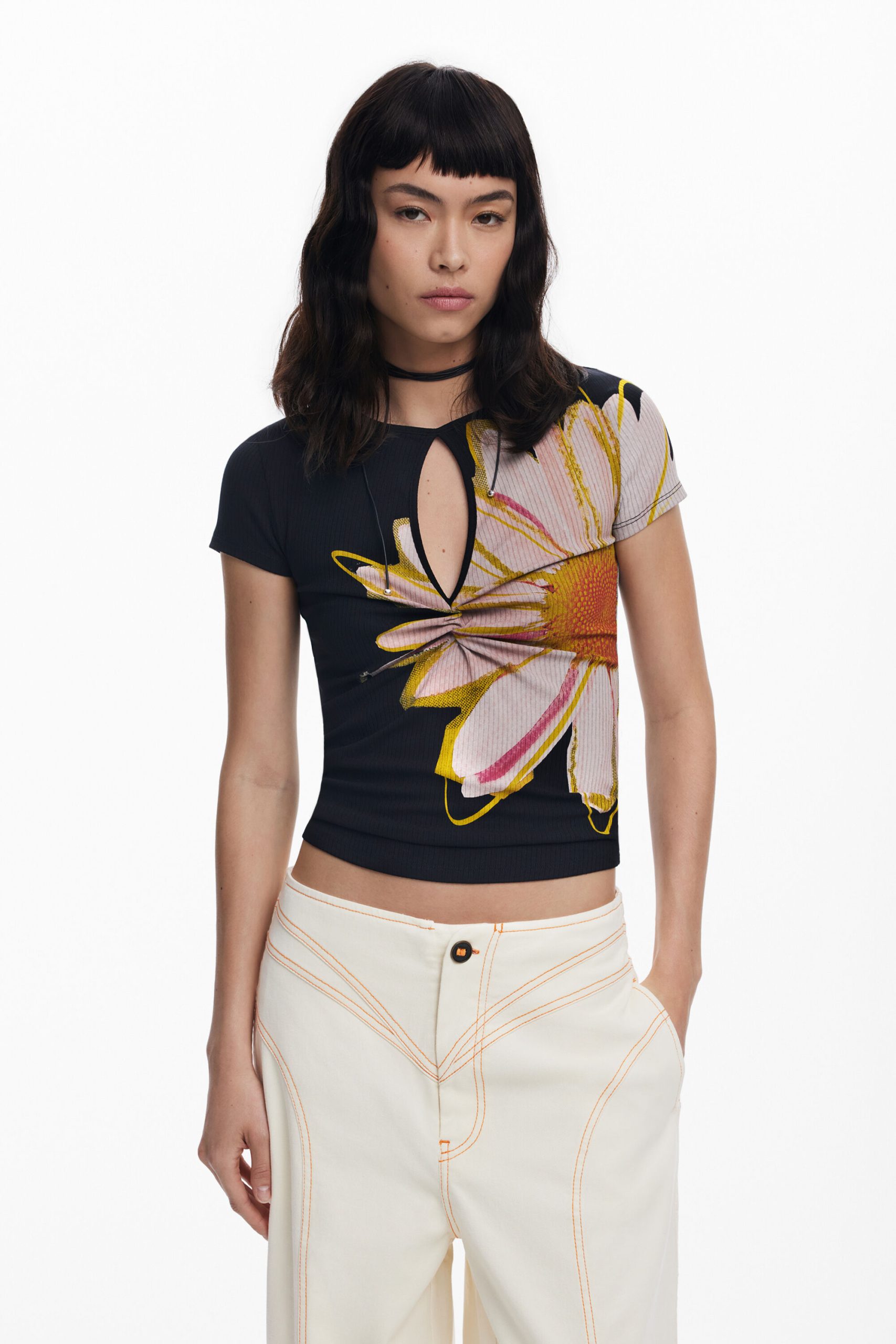 T-shirt met korte mouwen en een print van een grote bloem, in contrasterend kleurontwerp en met een opening aan de voorkant.