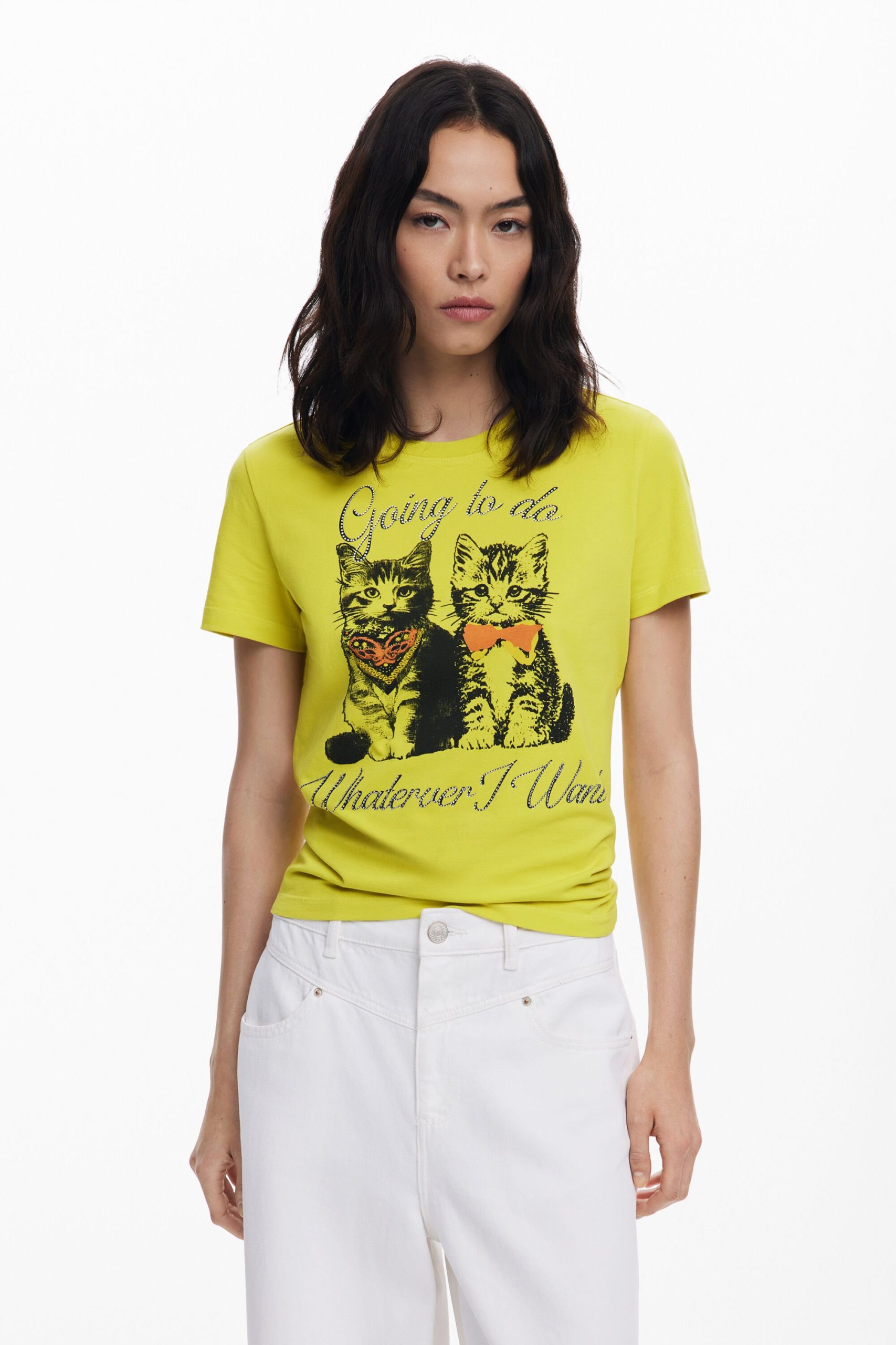 T-shirt met korte mouwen met illustratie van katten en geborduurde tekst in strass “Going to do whatever i want”