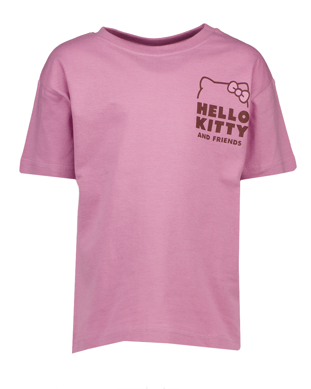 Deze paarse T-shirt voor jongens en meisjes heeft korte mouwen en een ronde hals. Op de borst staat een opdruk met het bekende Hello Kitty-figuurtje en de tekst ‘Hello Kitty and friends’. De stof oogt glad en de afwerking is eenvoudig. Door de opvallende print krijgt de T-shirt een speelse uitstraling. Geschikt voor dagelijks gebruik of om te dragen naar school.