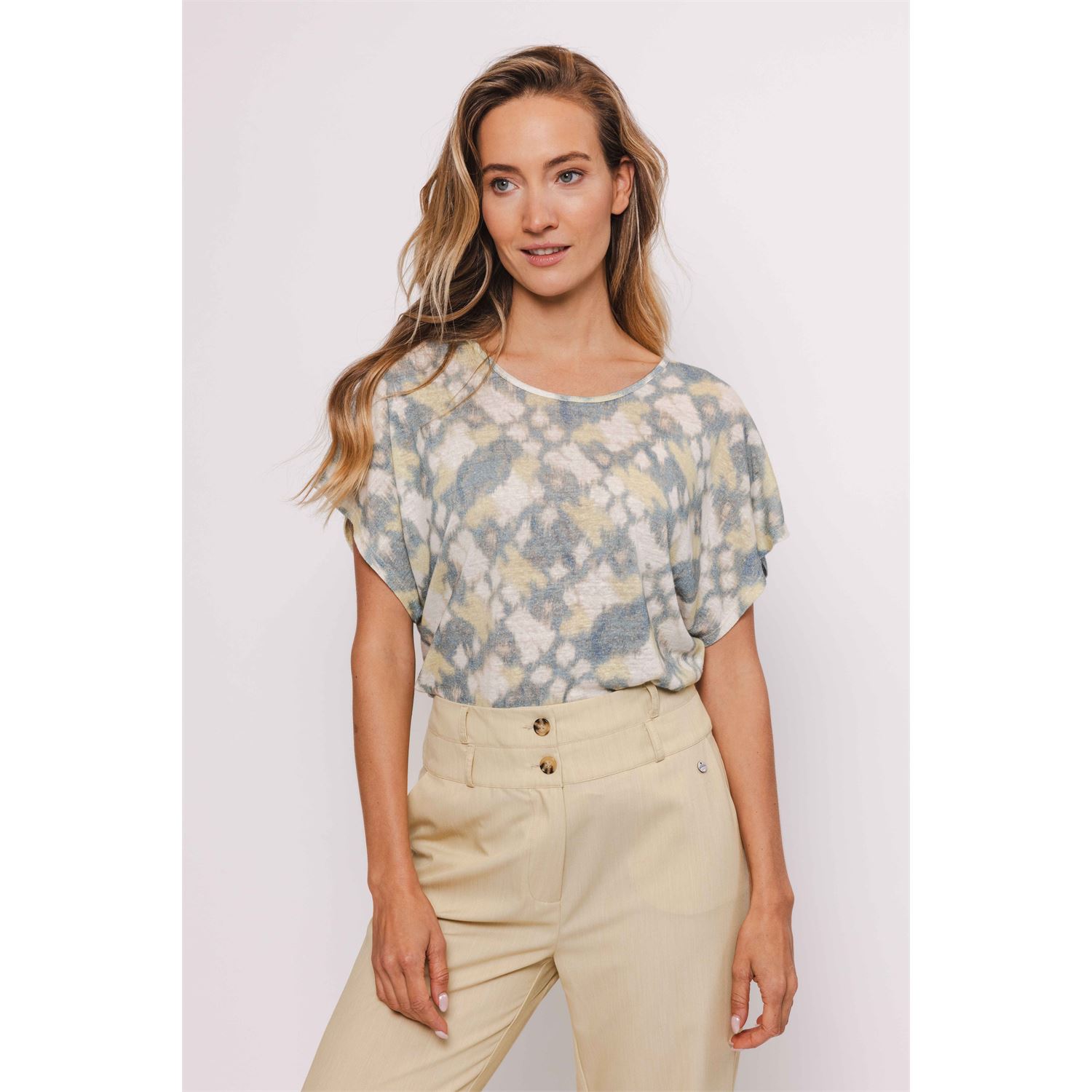 Deze top in linen/ viscose mix draagt heerlijk luchtig. De top heeft een aangeknipte mouw, ronde hals en bloezende fit door de elastieken afwerking bij de zoom. Voorzien van leuk splitje aan de achterzijde van de halslijn.