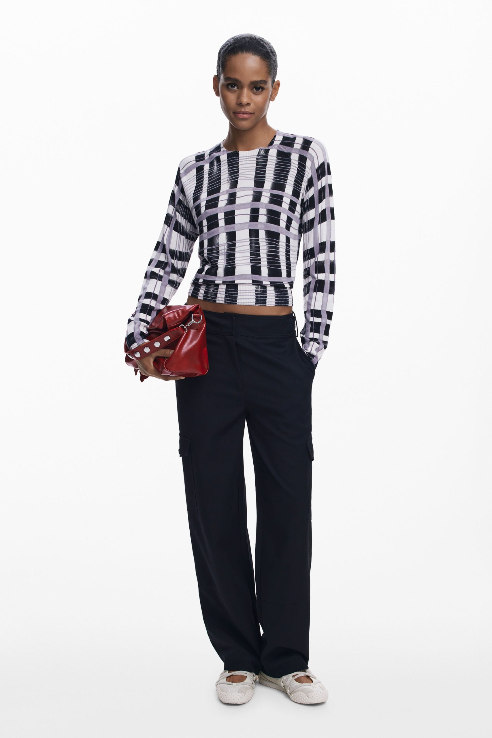 Lange cargobroek in tailormodel, met grote zakken op de pijpen en ritssluiting en knoop.