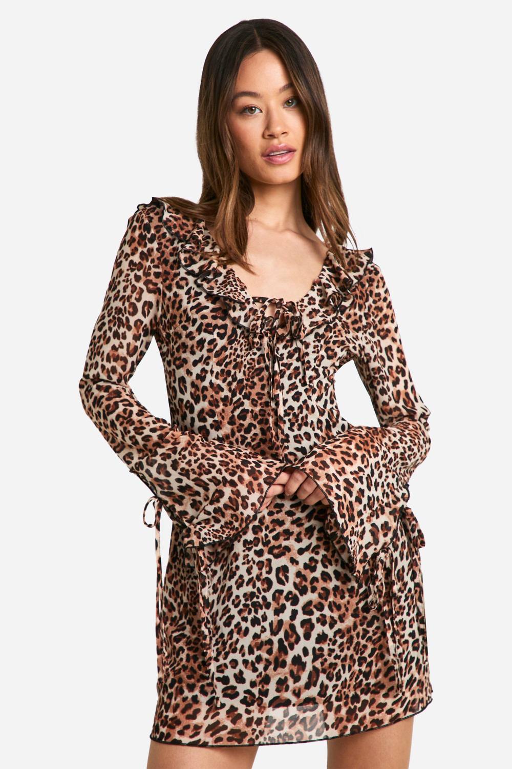 Tall Leopard Ruffle Tie Flared Sleeve Micro Mini Jurk