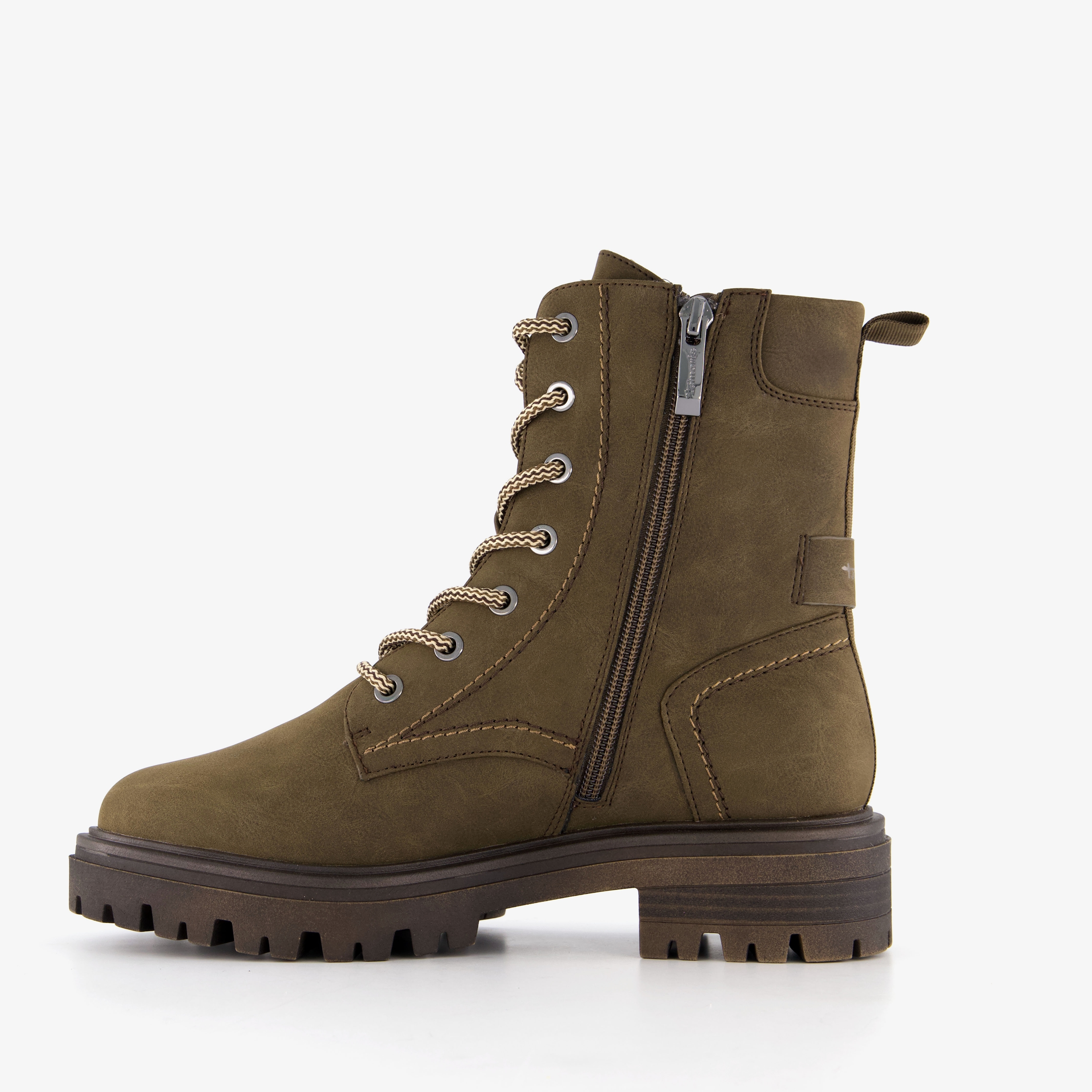 Olijfgroene veterboots voor dames uit de Tamaris collectie. Het buitenwerk is gemaakt van imitatieleer, het binnenwerk van textiel en de stevige zool met profiel van rubber. Voorzien van een veter- en ritssluiting en lusjes aan de achterzijde voor een makkelijke instap. De comfortabele binnenzool van textiel is niet uitneembaar. Hakhoogte is circa 2,5 cm en schachthoogte is 16 cm.