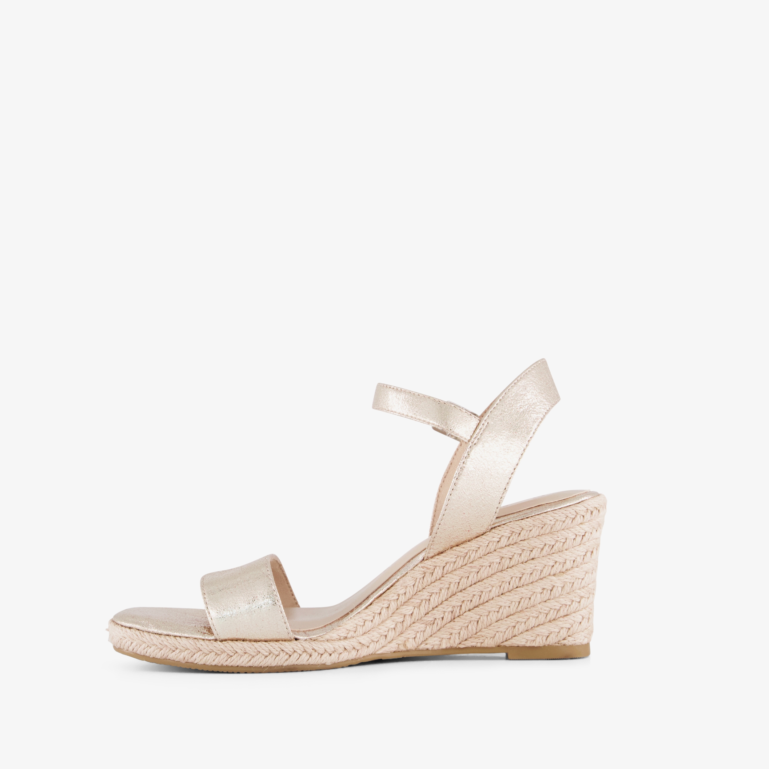 Goudkleurige espadrilles met sleehak van Tamaris. De sandalen zijn gemaakt van textiel en imitatieleer en hebben een gevlochten jute zool. Voorzien van bandjes over de tenen en een enkelbandje met gespsluiting. Deze mooie espadrilles hebben een sleehak van circa 8 cm. Het comfortabele voetbed van imitatieleer en is niet uitneembaar.
