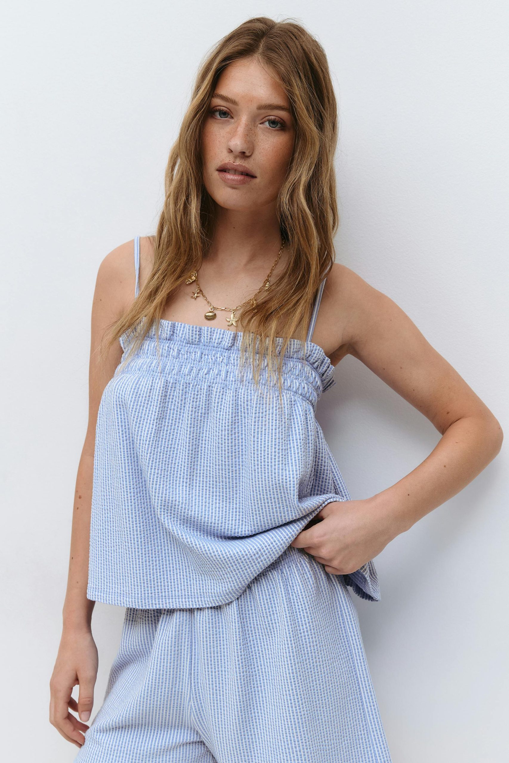 Gestreept hemdje met smokwerk aan de bovenkant. Het hemdje is blauw en heeft verstelbare schouderriemen. Het heeft getextureerde doek, normale pasvorm en normale lengte.