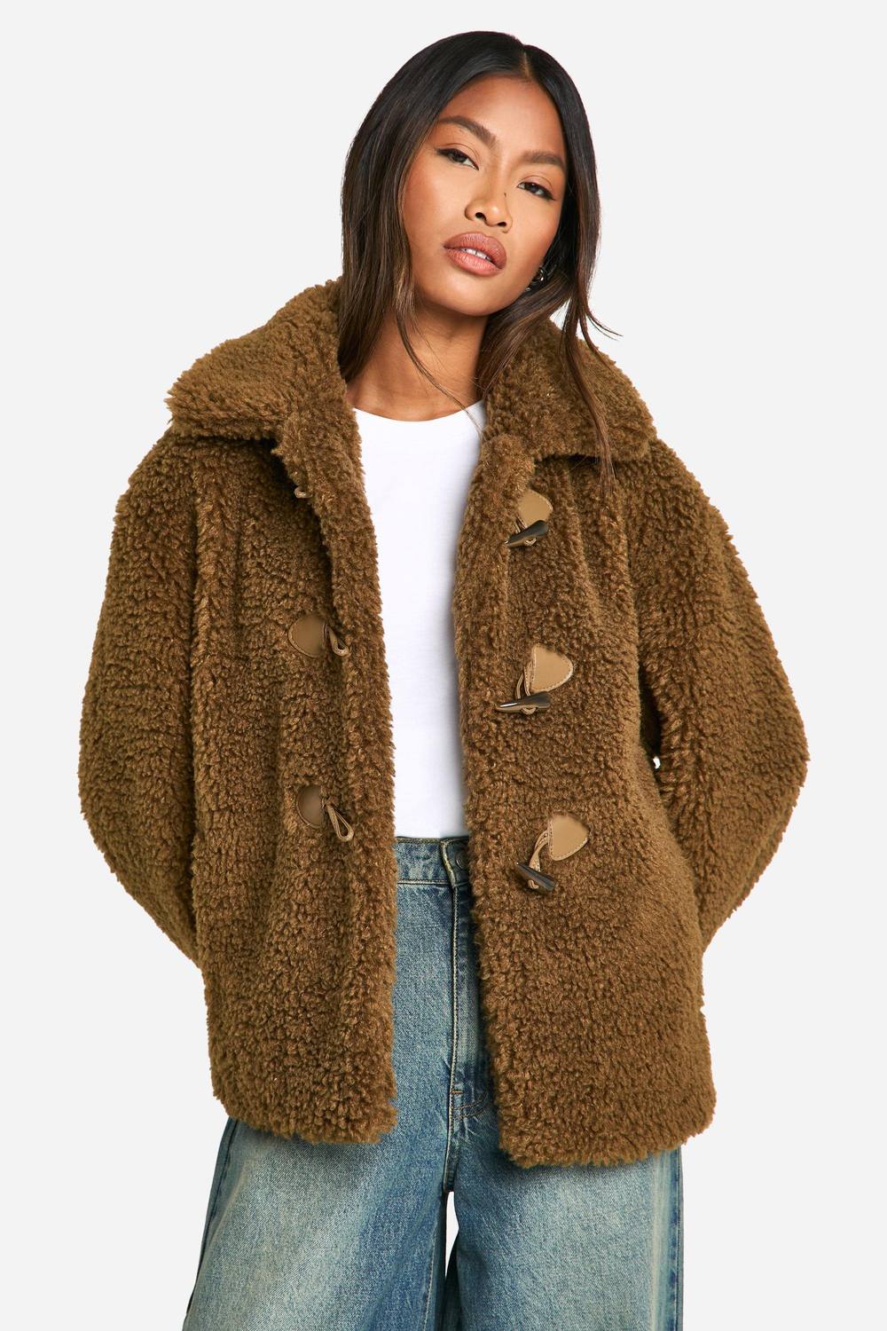 Gezellige teddy-gestructureerde namaakbontjas voor ultiem comfort Oversized pasvorm met losse schouders voor een ontspannen silhouet Kenmerkende sluitingen met knopen voor een speelse touch Brede revers voegt een stijlvol element toe Veelzijdige lengte, perfect om over verschillende outfits heen te dragen Omarm de gezelligste trend van het seizoen met deze onweerstaanbaar zachte teddy jas van Boohoo. Perfect voor de modebewuste vrouw die zowel stijl als comfort waardeert, is dit namaakbont wonder een must-have toevoeging aan je wintergarderobe. De oversized pasvorm en losse schouders creeren een ontspannen, moeiteloos ogende look die ideaal is voor casual uitstapjes. Combineer het met wijde jeans en sneakers voor een relaxte weekendbrunch, of draag het over een mididress en enkellaarsjes voor een chique ensemble op een familiereunie. De kenmerkende sluitingen met knopen voegen een speels element toe, waardoor deze jas een opvallend stuk is dat gegarandeerd de aandacht trekt. Of je nu boodschappen doet of met vrienden afspreekt voor een kop koffie, deze teddy jas houdt je warm en stijlvol gedurende de koelere maanden. boohoo Dames Toggle Detail Teddy Bontjas | Tobacco | Maat: 36