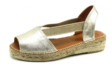 Goudkleurige espadrille artikel Etna van het Spaanse schoenenmerk Toni Pons. Deze espadrilles zijn gemaakt van leer en de elastische banden zorgen voor een perfecte pasvorm. Het leer is stevig gestikt aan de met touw omvlochten plateauzool. Koop jouw Toni Pons espadrilles online bij Stoute Schoenen ©.