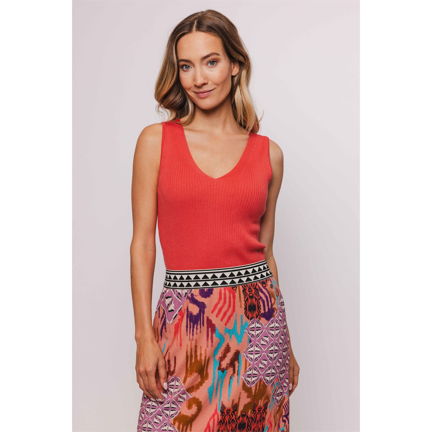 Deze fijne basic top is gemaakt van een viscose mix rib breisel. Aansluitende pasvorm met vrouwelijke V-hals.