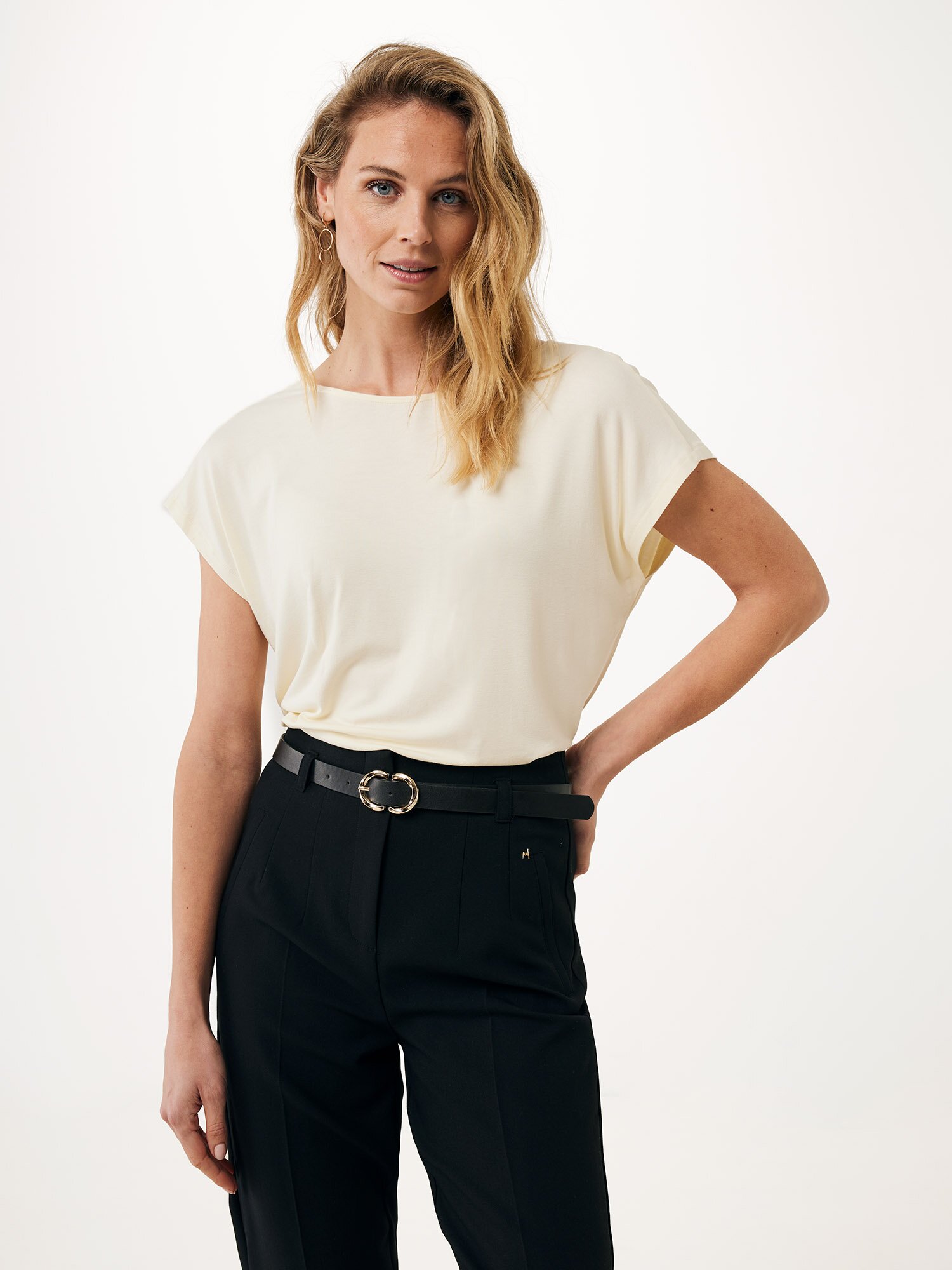Deze verfijnde top in een zachte roomkleur is gemaakt van viscose en elastaan, wat zorgt voor comfortabel draaggemak. De V-rug voegt een subtiel en stijlvol element toe dat perfect is voor een casual look met een moderne twist. Deze top is een ideale keuze voor verschillende gelegenheden. Combineer hem bijvoorbeeld met een zwarte high-waist broek voor een elegante uitstraling. Bekijkonze dameskledingvoor bijpassende items.