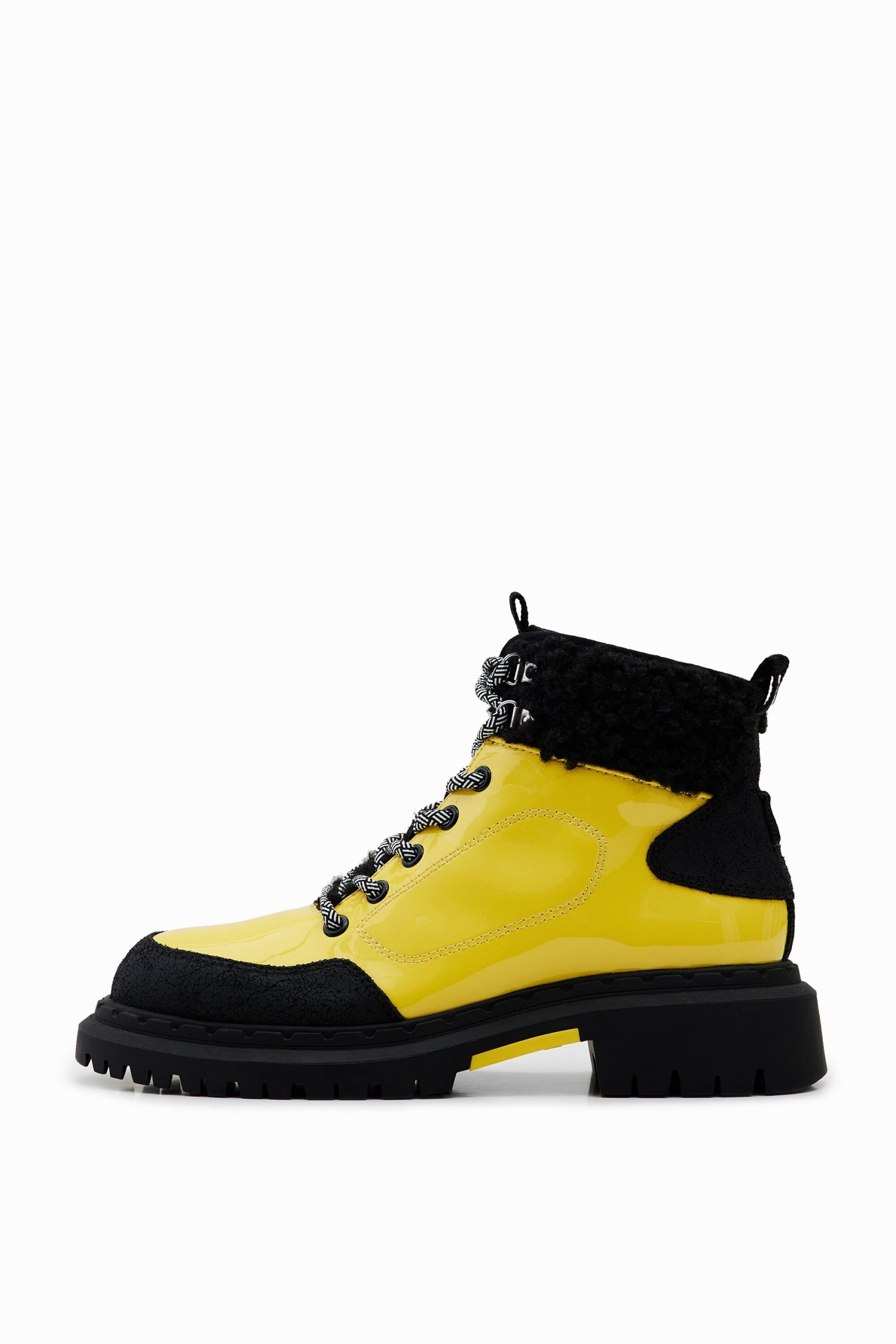Duurzame trekkinglaars in diverse kleuren, gemaakt van lakleer met bontdetails op het bovendeel. Met tweekleurige trekkingveters en zwarte gerecyclede rubberen zolen.